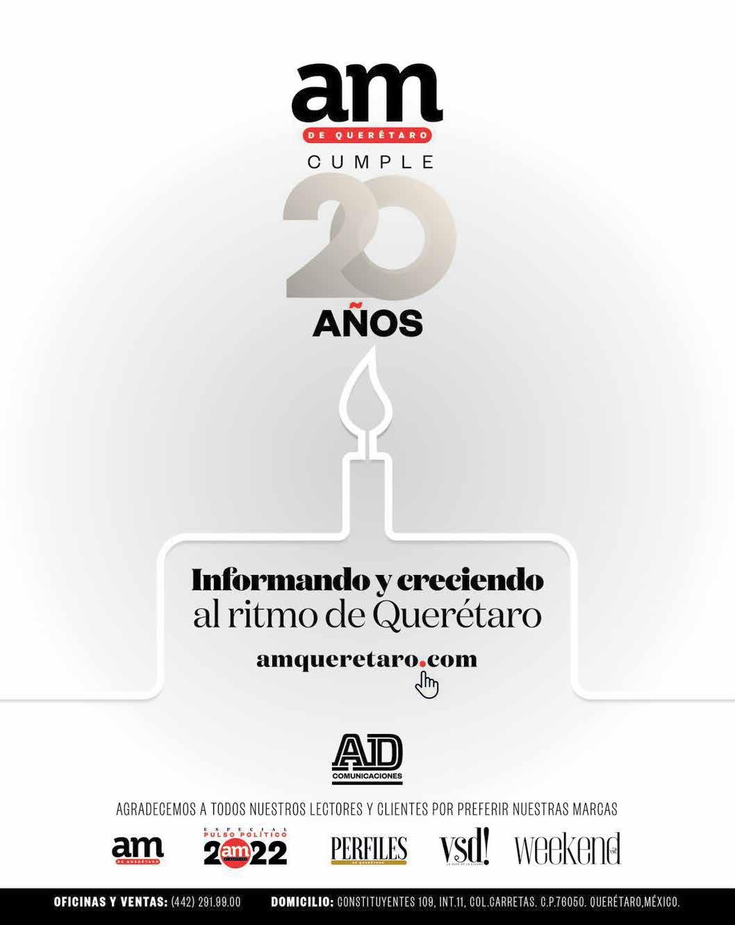 No se devuelven originales. Dirección Av. Constituyentes 109 int. 11, Colonia Carretas, CP. 76050, Santiago de Querétaro, Qro. Representantes de publicidad en México D.F: Periódico Reforma, Av. México Coyoacán No. 40, Col. Santa Cruz Atoyac, Tel. 56-28-74-41 y 5 -28-78-78 Representante en Monterrey: Periódico El Norte, Washington 629, 4o. Ote, Monterrey N.L, Tel. 83-18-84-15 Representante en Guadalajara: Periódico Mural, Mariano Otero 4047, Col. La Calma, Zapopan , Jalisco. Tel. (3) 134-35-00. AM DE QUERÉTARO es una publicación diaria. Martes 13 de diciembre de 2022. Número de Certificado de Reserva de Derechos al Uso Exclusivo otorgado por el Instituto Nacional de Derecho de Autor: 04 - 2019 - 010810045700-101. Número de Certificado de Licitud de Título y Contenido No. 17050 de fecha 12 de diciembre de 2017. Domicilio de la Publicación: Av. Constituyentes 109 int. 11, Colonia Carretas, CP. 76050, Santiago de Querétaro, Qro. Imprenta: Bucareli No. 8, Col. Centro, Alcaldía Cuauhtémoc, C.P. 06040, CDMX Servicios informativos: Cuartoscuro, AP, Mexsport, Istockphoto. Prohibida la reproducción total o parcial del contenido de esta edición. DIRECTOR GENERAL EDITORIAL Miguel Ángel Flores García mflores@adcomunicaciones.mx CONTENIDOS editores@amqueretaro.com Miguel Tierrafría Magdiel Torres Georgina Fernández Juan Carlos Machorro Mauricio del Ángel Berenice Rodríguez ARTE E IMAGEN Marco A. Rodríguez Juan Palma Daniela Ramírez Diseño Editorial Isai López Fotografía y Video AMQUERETARO.COM internet@amqueretaro.com Lorena Rudo Editora Web Estefany González Community Manager Hans Alfonso Frei Nieto, José de la Garza Pedraza, Juan Germán Torres Landa García, Verónica Valverde, Alejandra Vega Reyes, Luis Miguel Rubín Colea, María Genoveva Anaya Saavedra, Mariana Vidales Guerrero, Óscar Peralta Casares, Pedro Ruiz Velasco, Mauricio Sánchez Botello CONSEJO EDITORIAL DIRECTOR COMERCIAL Antonio Collado Prieto acollado@adcomunicaciones.mx Editado por la empresa AD Comunicaciones S de RL de CV Directorio publicidad@adcomunicaciones.mx Móvil: (442) 479 14 89 Oficina: (442) 291 99 00 ALIANZAS DE COLABORACIÓN SUSCRIPCIONES Andrea Jiménez suscripciones@adcomunicaciones.mx CIRCULACIÓN Emmanuel Hernández pagos@adcomunicaciones.mx ADMINISTRACIÓN Mariana Picazo administracion@adcomunicaciones.mx JEFATURA DE INFORMACIÓN Marittza Navarro JEFATURA DE REPORTEROS Salvador Castillo EDITORA GENERAL VSD! Y WEEKEND Arcelia Guadarrama Certificado de Circulación, Cobertura y Perfil del Lector folio 01058-RHY emitido por y registrado en el Padrón Nacional de Medios Impresos de la Segob.