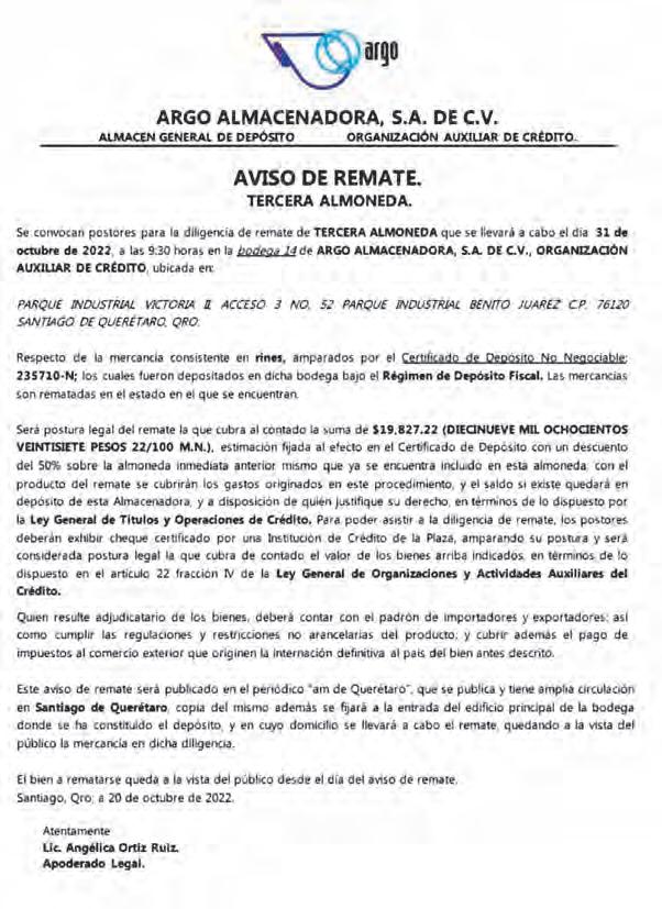 DE OCTUBRE DE 2022 No se devuelven originales. Dirección: Av. Constituyentes 109 int. 11, Colonia Carretas, CP. 76050, Santiago de Querétaro, Qro. Representantes de publicidad en México D.F: Periódico Reforma, Av. México Coyoacán No. 40, Col. Santa Cruz Atoyac, Tel. 56-28-74-41 y 5 -28-78-78 Representante en Monterrey: Periódico El Norte, Washington 629, 4o. Ote, Monterrey N.L, Tel. 83-18-84-15 Representante en Guadalajara: Periódico Mural, Mariano Otero 4047, Col. La Calma, Zapopan Jalisco. Tel. (3) 134-35-00. AM DE QUERÉTARO es una publicación diaria. Jueves 20 de Octubre de 2022. Número de Certificado de Reserva de Derechos al Uso Exclusivo otorgado por el Instituto Nacional de Derecho de Autor: 04 - 2019 - 010810045700-101. Número de Certificado de Licitud de Título y Contenido No. 17050 de fecha 12 de diciembre de 2017. Domicilio de la Publicación: Av. Constituyentes 109 int. 11, Colonia Carretas, CP. 76050, Santiago de Querétaro, Qro. Imprenta: Bucareli No. 8, Col. Centro, Delegación, Cuauhtémoc, C.P. 01300, CDMX. Servicios informativos: Cuartoscuro, AP, Mexsport, Istockphoto, The New York Times Syndicate. Prohibida la reproducción total o parcial del contenido de esta edición. Certificado de Circulación, Cobertura y Perfil del Lector folio 01058-RHY emitido por y registrado en el Padrón Nacional de Medios Impresos de la Segob.