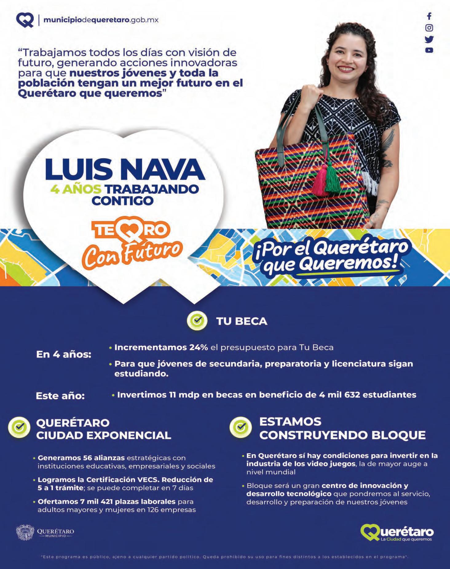 Nava Guerrero finalmente informó que, para impulsar al talento deportivo, se efectua ron obras y acciones como la remodelación de 23 espacios deportivos y la construcción de la Unidad Deportiva La Purí sima; además de la activación de ligas y torneos con la parti cipación de más de 13 mil de portistas y la realización de la Carrera Nocturna con la pre sencia de 5 mil corredores.