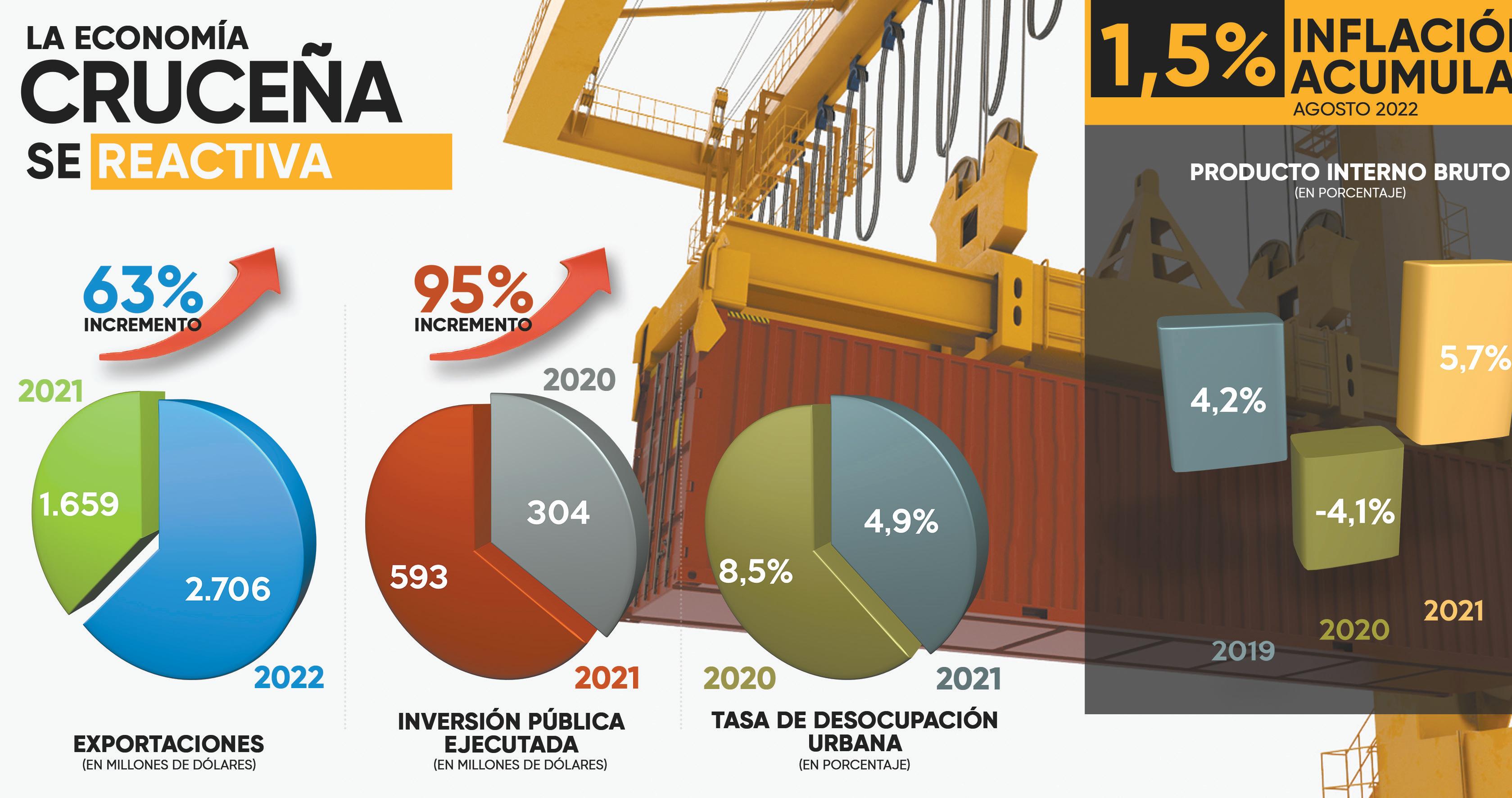 Como muestra de la recupe ración económica, las exporta ciones del departamento llega ron a $us 2.706 millones a julio de 2022, superando en un 63% a lo logrado en similar periodo de 2021. Del total, destaca el sector de la industria de manu facturas con $us 1.649 millo nes, hidrocarburos con $us 746 millones y el sector agropecua rio con $us 291 millones infor mó el Ministro de Economía y Finanzas Públicas.