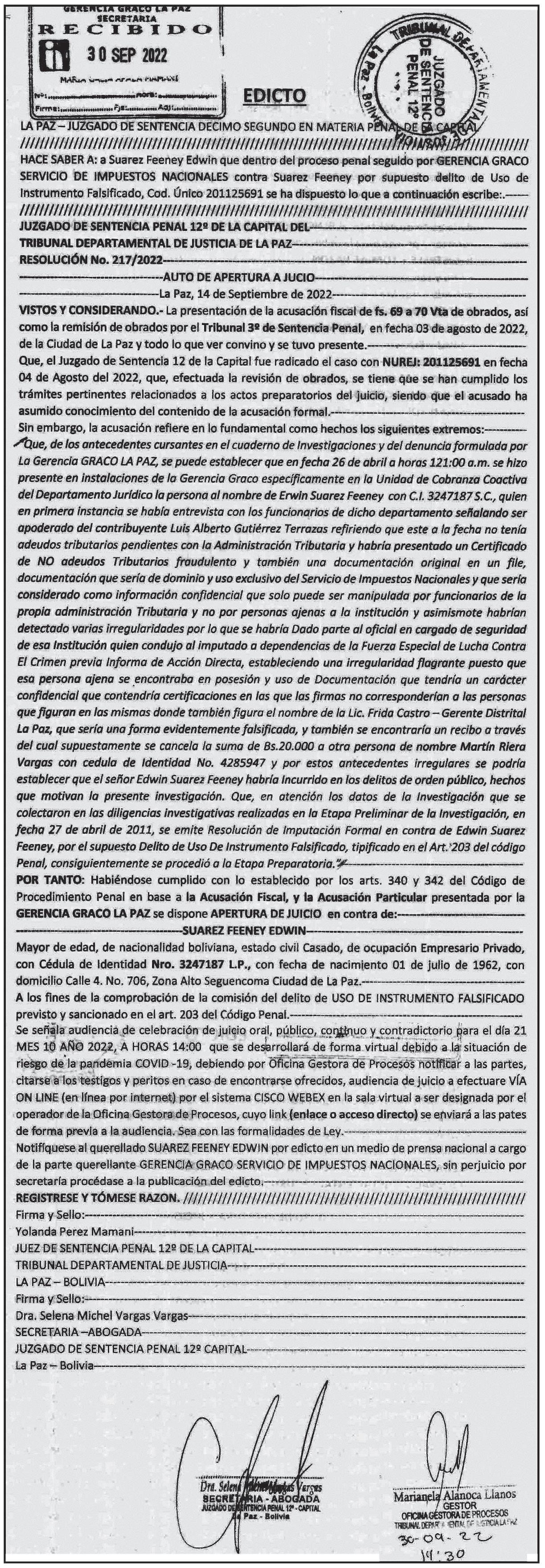 “Personal de la FELCC de El Alto procede a dar cumpli miento a este mandamiento de aprehensión en contra de esta persona”, confirmó.