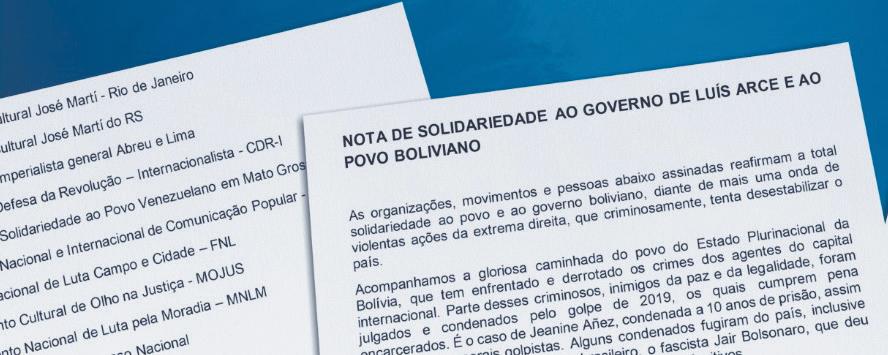 “Ante esos hechos, reafirmamos nuestra solidaridad al gobierno del presidente Luis Arce, al MAS, a los movimientos sociales y al pueblo boliviano que sigue unido y organizado para enfrentar a la derecha fascista y fundamentalista”, afirman los signatarios.