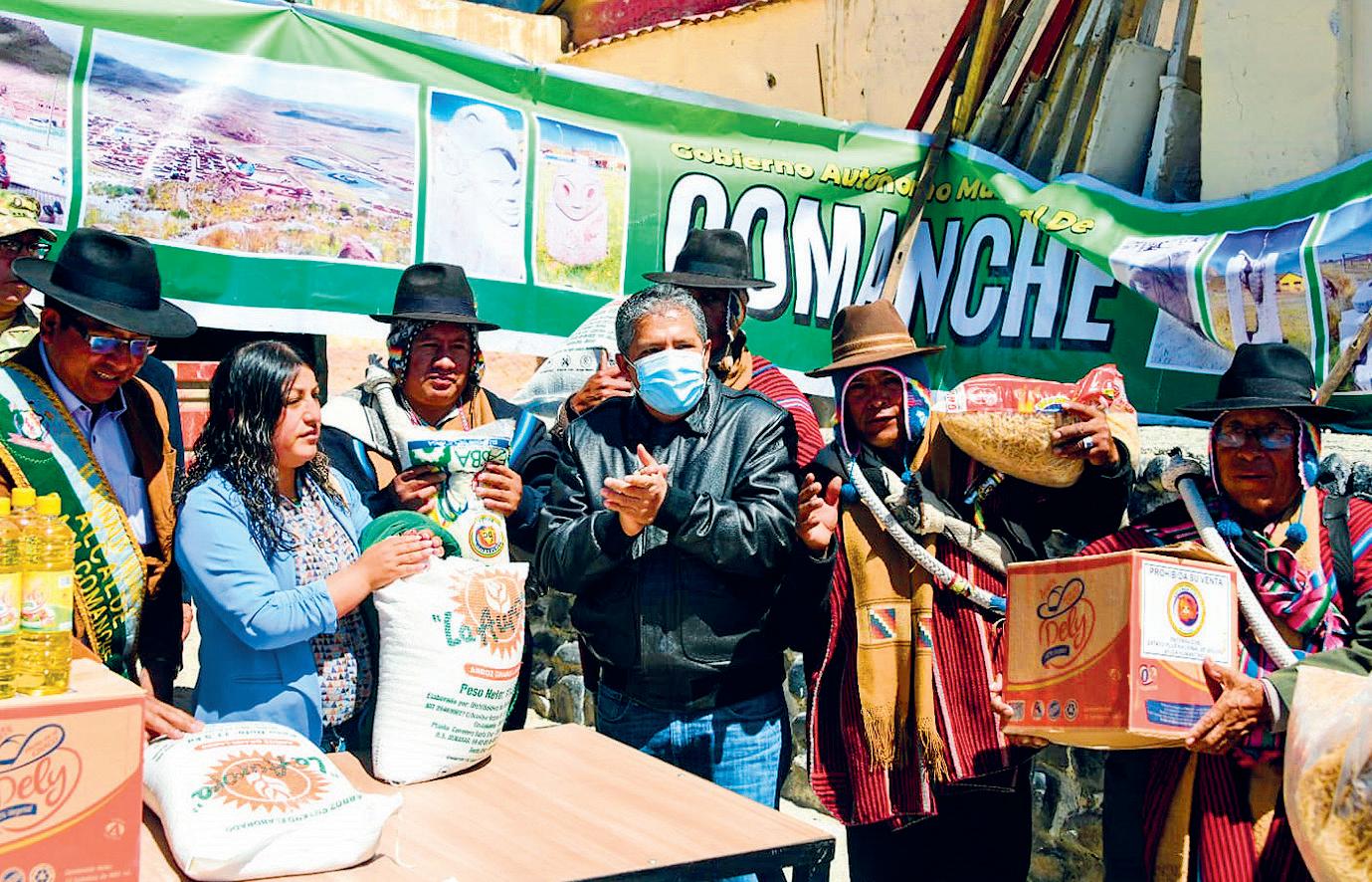 das a 372 familias; Charaña, con 12,54 toneladas para apoyar a 310 familias; Tacacoma, con 8,41 toneladas para 208 familias; y Comanche, con 12,13 toneladas para 300 familias. Toda la ayuda asciende a Bs 419.037,14.