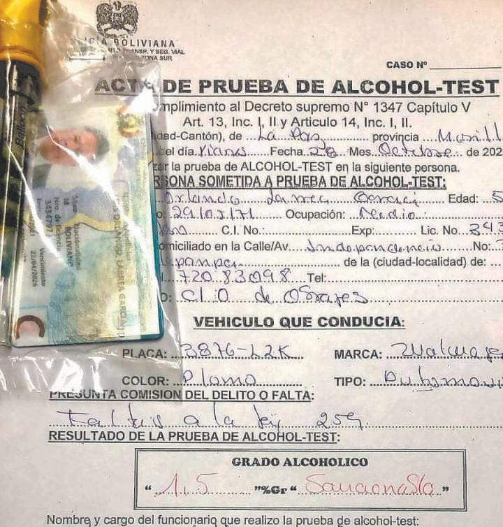 Efectivos de la Policía de la zona Sur de La Paz sorprendieron esta ma drugada al presidente del Colegio Médico de Boli via, Luis Larrea, cuando conducía un motorizado en estado de ebriedad.