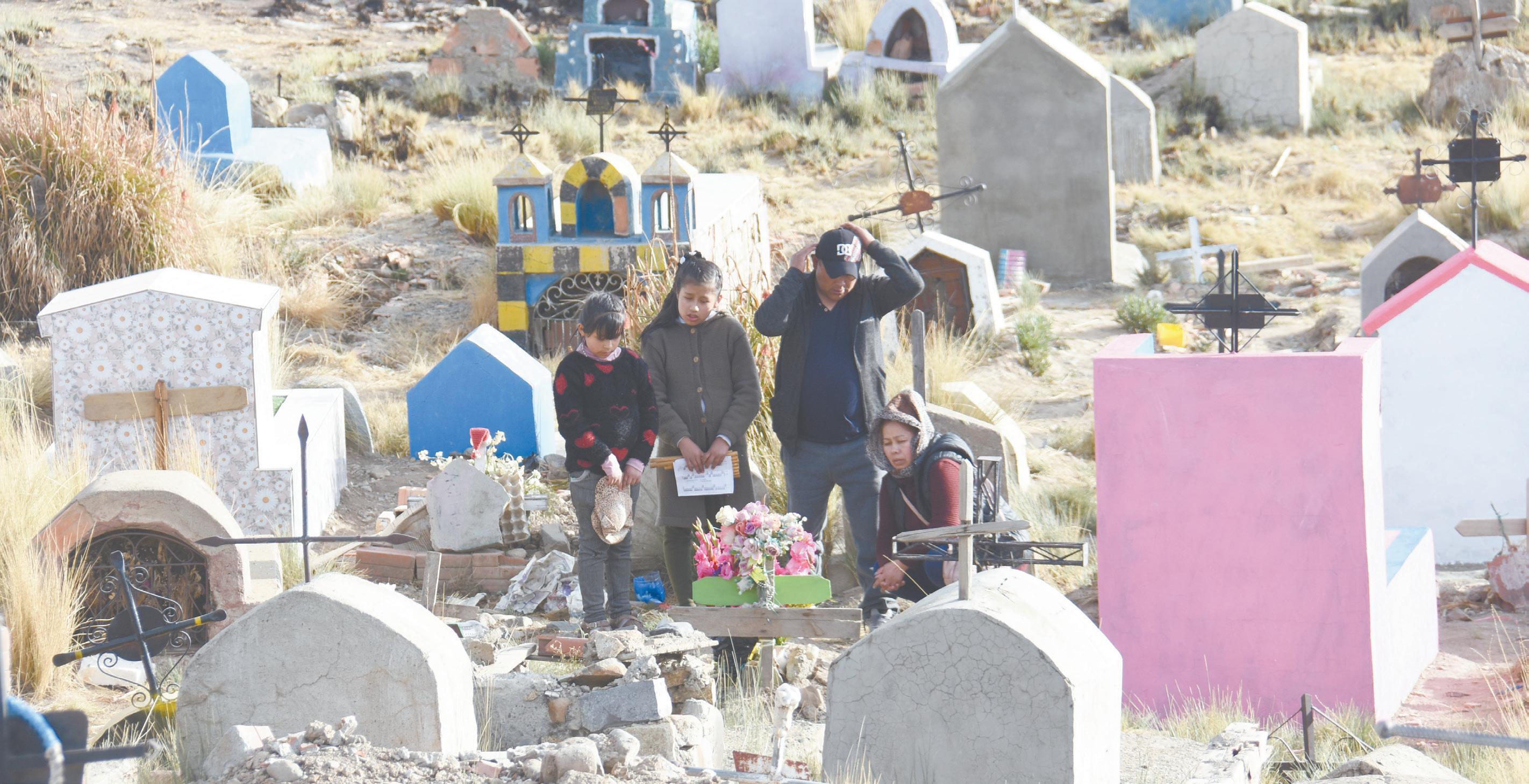 Una familia visita una tumba en el Cementerio de Villa Ingenio, uno de los camposantos de El Alto.
