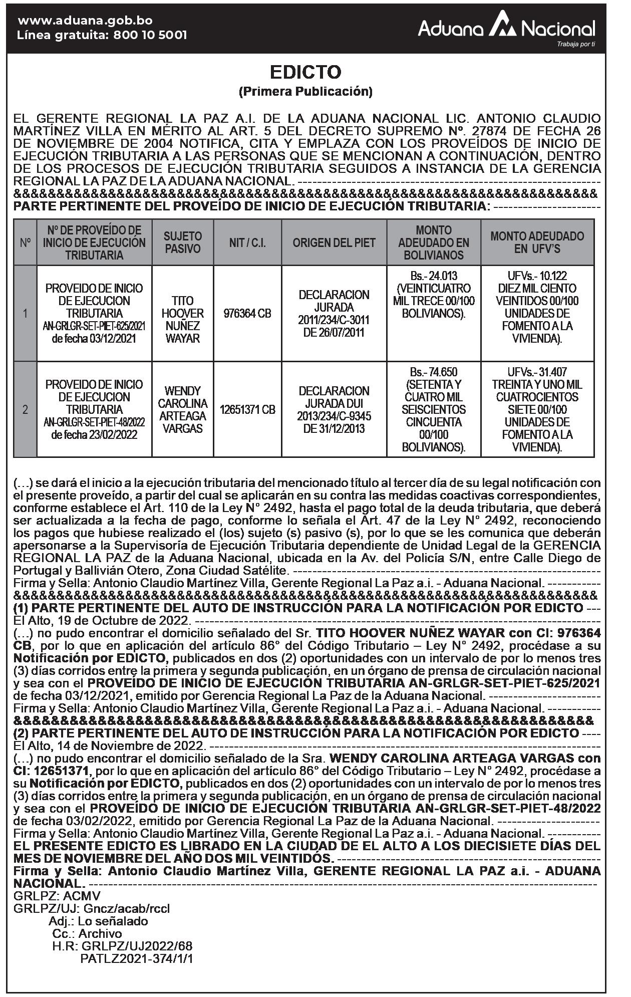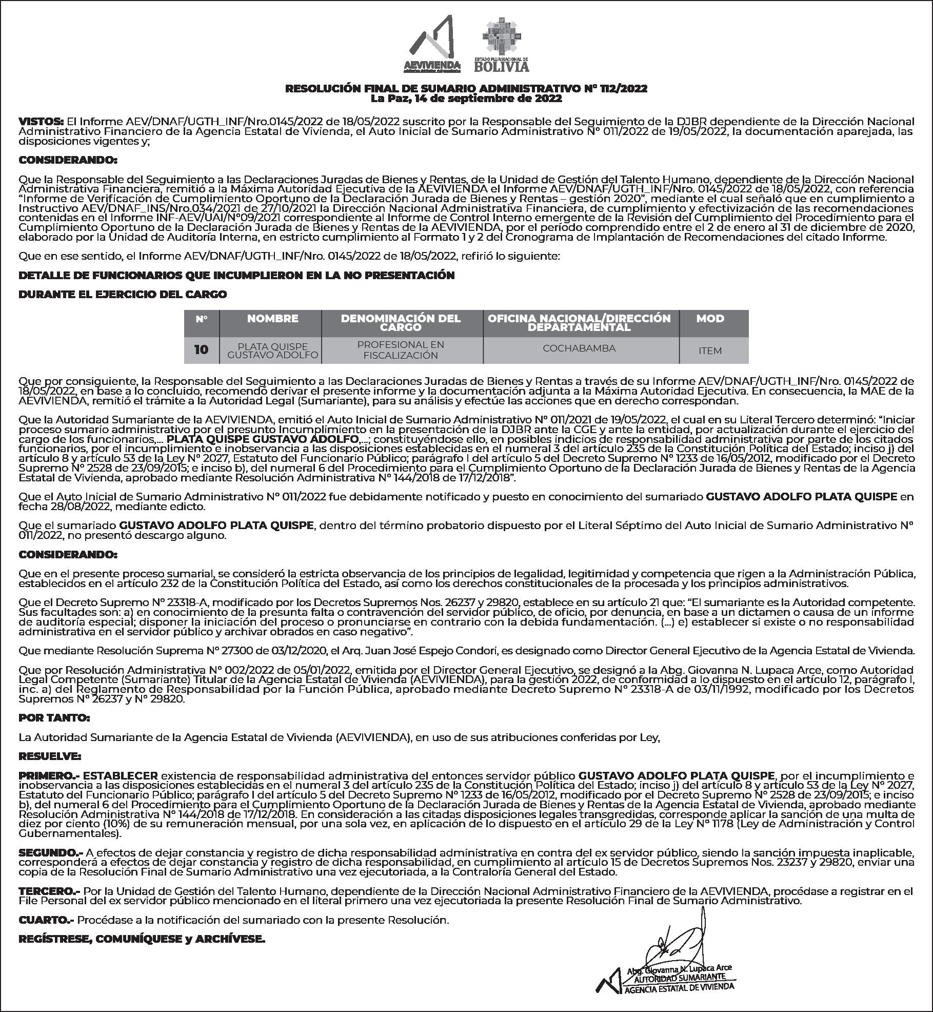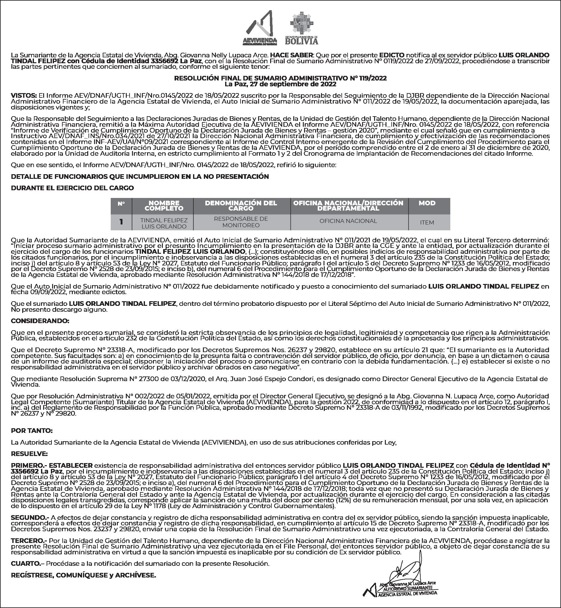 La Sumariante de la Agencia Estatal de Vivienda, Abg. Giovanna Nelly Lupaca Arce. HACE SABER: Que por el presente EDICTO notifica al ex servidor público JOSE DAVID MOLINA BANEGAS con el la Resolución Final de Sumario Administrativo Nº 0138/2022 de 24/10/2022, procediéndose a transcribir las partes pertinentes que conciernen al sumariado, conforme el siguiente tenor: RESOLUCIÓN FINAL DE SUMARIO ADMINISTRATIVO N° 138/2022 La Paz, 24 de octubre de 2022 VISTOS: El Informe AEV/DNAF/UGTH_INF/Nro.0145/2022 de 18/05/2022 suscrito por la Responsable del Seguimiento de la DJBR dependiente de la Dirección Nacional Administrativo Financiero de la Agencia Estatal de Vivienda, el Auto Inicial de Sumario Administrativo N° 011/2022 de 19/05/2022, la documentación aparejada, las disposiciones vigentes y; Que la Responsable del Seguimiento a las Declaraciones Juradas de Bienes y Rentas, de la Unidad de Gestión del Talento Humano, dependiente de la Dirección Nacional Administrativa Financiera, remitió a la Máxima Autoridad Ejecutiva de la AEVIVIENDA el Informe AEV/DNAF/UGTH_INF/Nro. 0145/2022 de 18/05/2022, con referencia “Informe de Verificación de Cumplimiento Oportuno de la Declaración Jurada de Bienes y Rentas – gestión 2020”, mediante el cual señaló que en cumplimiento a Instructivo AEV/DNAF_INS/Nro.034/2021 de 27/10/2021 la Dirección Nacional Administrativa Financiera, de cumplimiento y efectivización de las recomendaciones contenidas en el Informe INF-AEV/UAI/N°09/2021 correspondiente al Informe de Control Interno emergente de la Revisión del Cumplimiento del Procedimiento para el Cumplimiento Oportuno de la Declaración Jurada de Bienes y Rentas de la AEVIVIENDA, por el período comprendido entre el 2 de enero al 31 de diciembre de 2020, elaborado por la Unidad de Auditoría Interna, en estricto cumplimiento al Formato 1 y 2 del Cronograma de Implantación de Recomendaciones del citado Informe. Que en ese sentido, el Informe AEV/DNAF/UGTH_INF/Nro. 0145/2022 de 18/05/2022, refirió lo siguiente: DETALLE DE FUNCIONARIOS QUE INCUMPLIERON EN LA NO PRESENTACIÓN DESPUÉS DEL EJERCICIO DEL CARGO