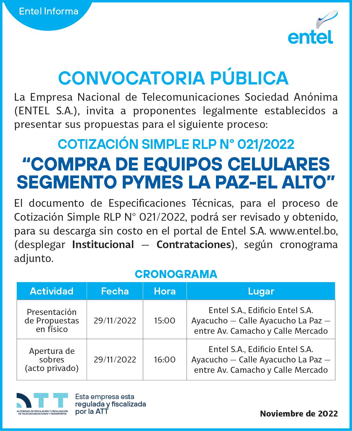 Las propuestas deberán ser presentadas en oficinas del Empoderar de la ciudad de Sucre a más tardar hasta el dia martes 29 de noviembre de 2022 hasta horas 09:00 a.m., Más información en www.empoderar.gob.bo o al 72895074.