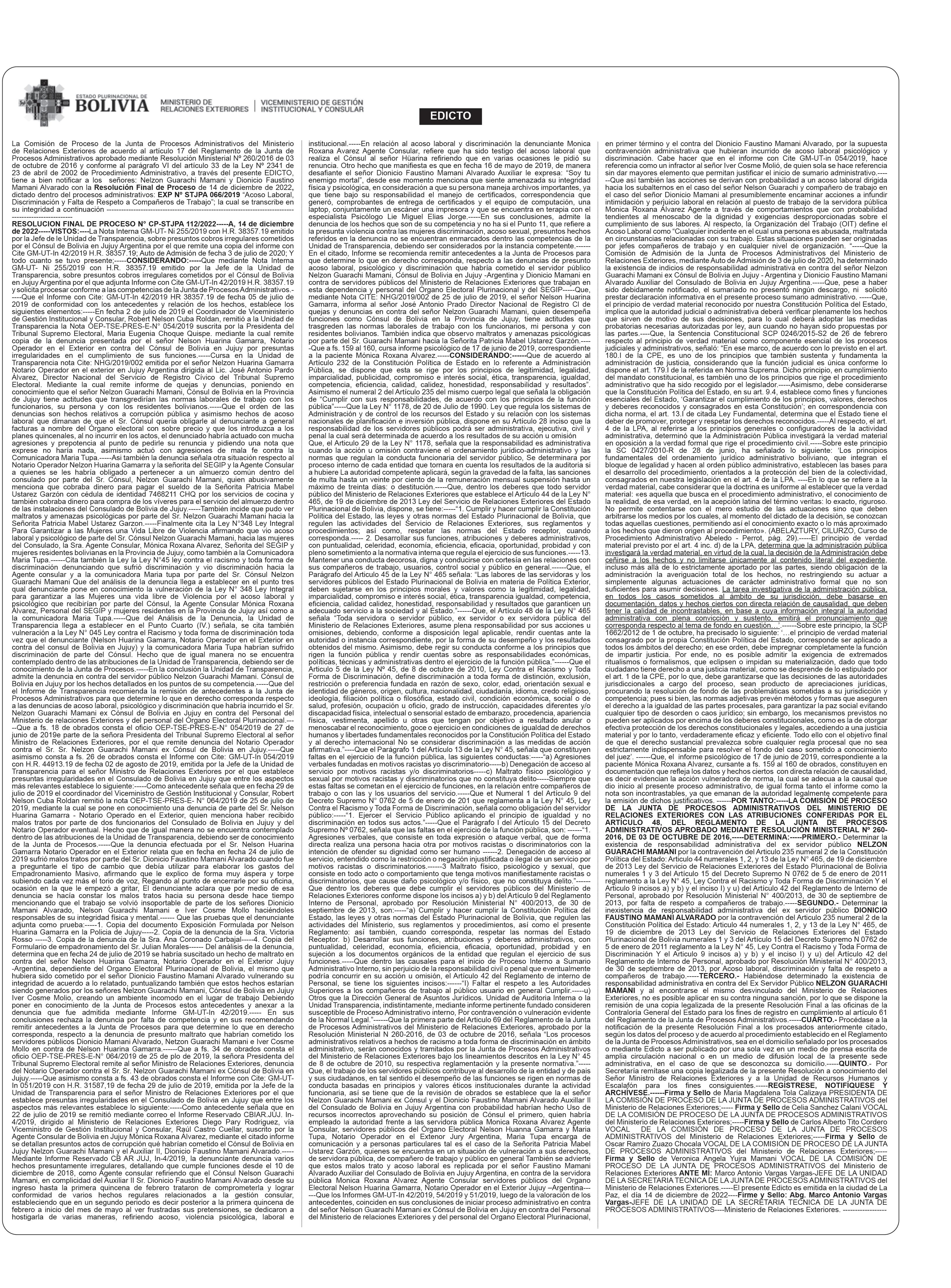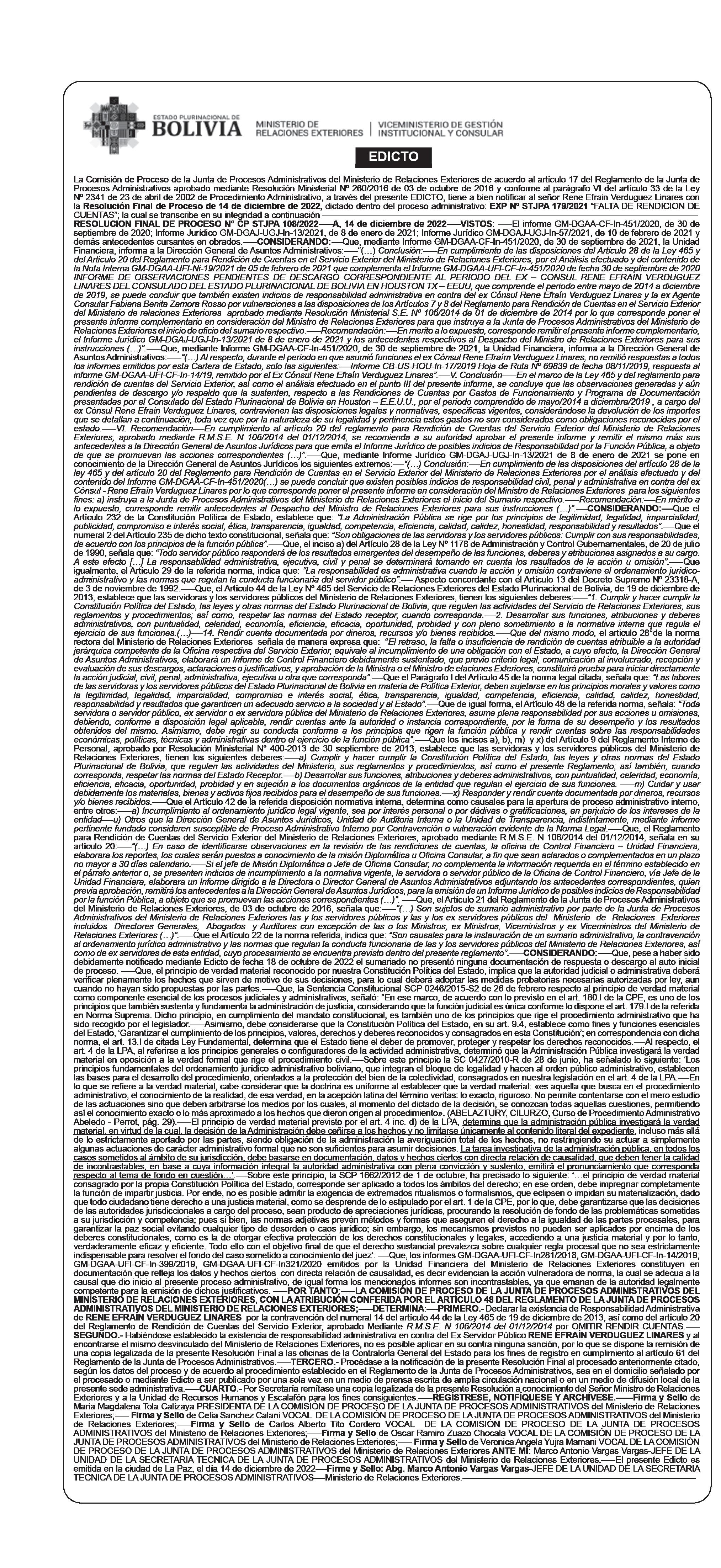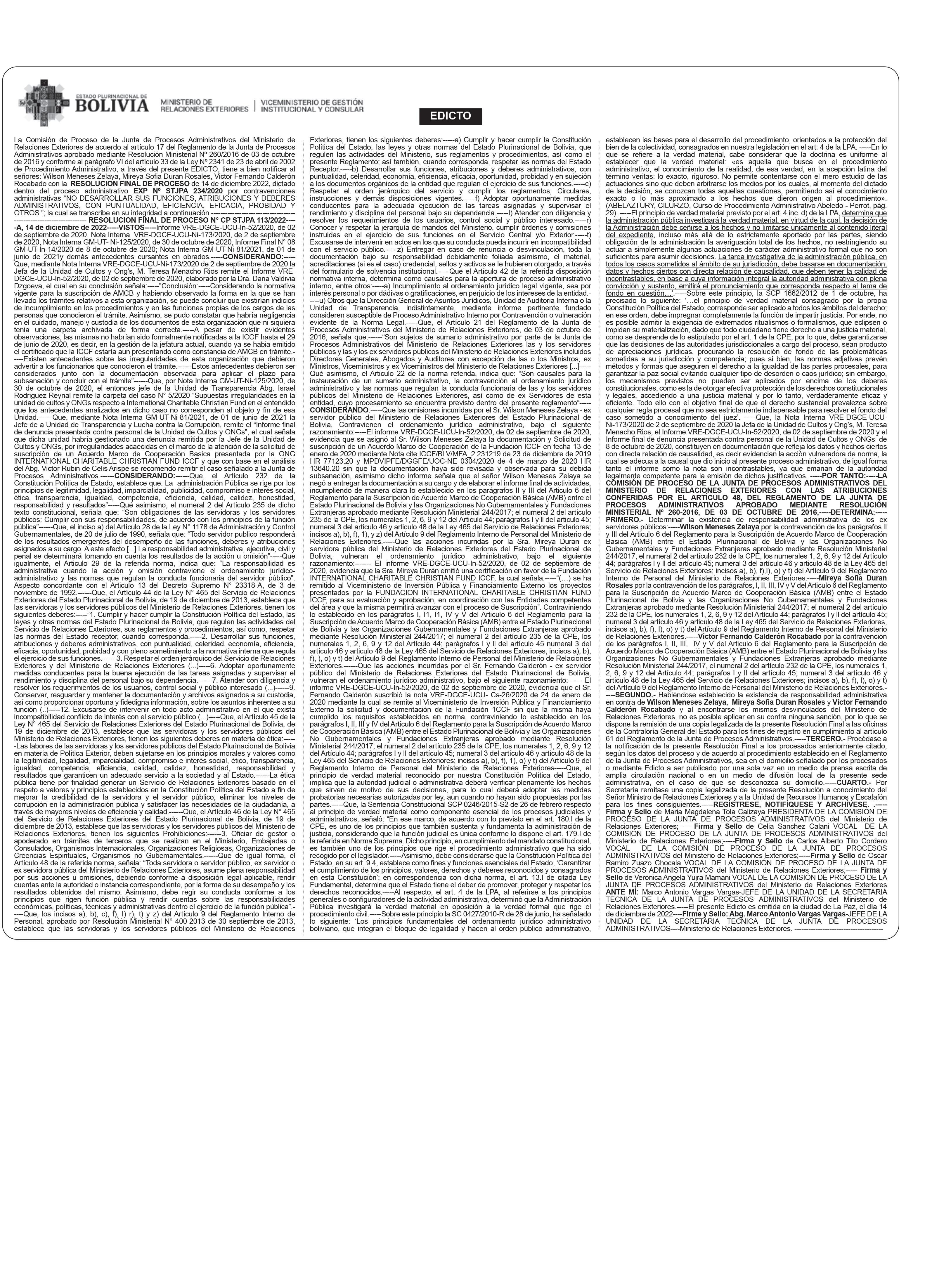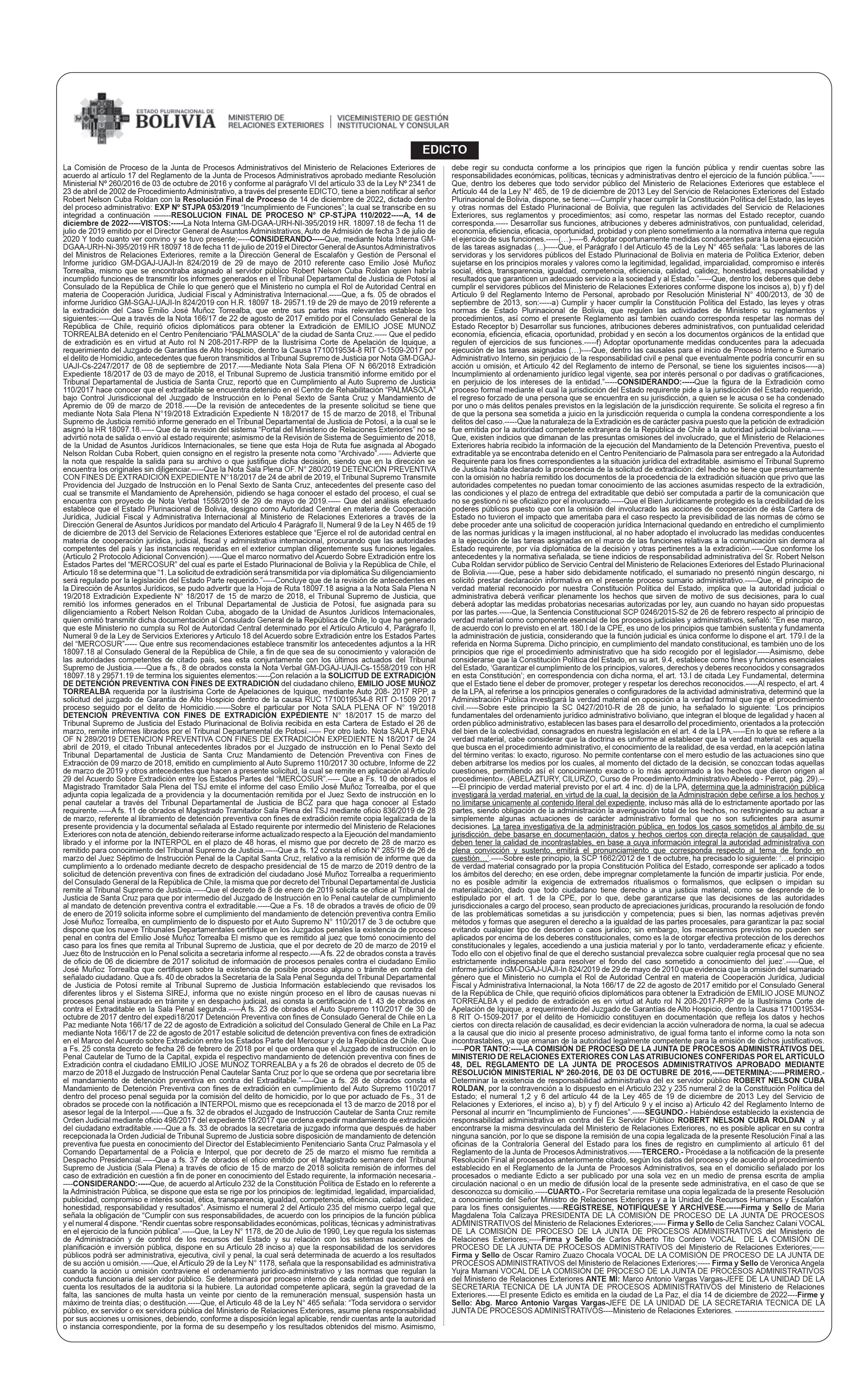 Personal, y el artículo 25 del Reglamento para emisión de pasaportes diplomáticos oficiales y de servicio bajo el siguiente razonamiento: No restituyó el pasaporte con código BE01099 asignado a su persona ni los de sus dependientes (esposa e hijos) con códigos BE01100, BE01101, BE01102.-----Rosalía del Villar Hinojosa por presuntamente contravenir lo establecido en los incisos b) y c) del Artículo 42 del Reglamento Interno de Personal y el artículo 25 del Reglamento para emisión de pasaportes diplomáticos oficiales y de servicio, bajo el siguiente razonamiento: No restituyó al MRE el pasaporte con código BE01310 asignado a su persona.------Fabiana Alicia Zenteno Lara por presuntamente contravenir lo establecido en los incisos b) y c) del Artículo 42 del Reglamento Interno de Personal y el artículo 25 del Reglamento para emisión de pasaportes diplomáticos oficiales y de servicio, bajo el siguiente razonamiento: No restituyó el pasaporte con código DE00429 asignado a su persona y el de su dependiente (esposa) con código DE000443.-----Jackeline Montaño Castro por presuntamente contravenir lo establecido en los incisos b) y c) del Artículo 42 del Reglamento Interno de Personal y el artículo 25 del Reglamento para emisión de pasaportes diplomáticos oficiales y de servicio bajo el siguiente razonamiento: No restituyó al MRE el pasaporte con código BE01295 asignado a su persona.------Rosa Elena Argandoña Yarari por presuntamente contravenir lo establecido en los incisos b) y c) del Artículo 42 del Reglamento Interno de Personal y el artículo 25 del Reglamento para emisión de pasaportes diplomáticos oficiales, bajo el siguiente razonamiento: No restituyó el pasaporte con código B001946 asignado a su persona y el de su dependiente (hijo) con código B001965.-----SEGUNDO.Se dispone la apertura del término probatorio de 10 días hábiles a partir de su notificación conminando a los procesados a señalar en su primer escrito su correo electrónico o domicilio para futuras notificaciones, caso contrario los actuados del proceso serán notificados en la Secretaria Técnica de la Junta de Procesos Administrativos.-----TERCERO.- Notifíquese a los procesados de acuerdo al procedimiento establecido en el Reglamento de la Junta de Procesos Administrativos.------CUARTO.- Una vez notificado el presente auto Inicial de Proceso, el Vocal relator asignado por sorteo quedara encargado de sustanciar el proceso administrativo conforme a procedimiento.-----REGÍSTRESE, NOTIFÍQUESE Y ARCHÍVESE.----- .------ Firma y Sello de Maria Magdalena Tola Calizaya PRESIDENTA DE LA COMISIÓN DE PROCESO DE LA JUNTA DE PROCESOS ADMINISTRATIVOS del Ministerio de Relaciones Exteriores;----- Firma y Sello de Celia Sanchez Calani VOCAL DE LA COMISIÓN DE PROCESO DE LA JUNTA DE PROCESOS ADMINISTRATIVOS del Ministerio de Relaciones Exteriores;-----Firma y Sello de Carlos Alberto Tito Cordero VOCAL DE LA COMISIÓN DE PROCESO DE LA JUNTA DE PROCESOS ADMINISTRATIVOS del Ministerio de Relaciones Exteriores;----Firma y Sello de Patricia Raquel Limachi Leon VOCAL SUPLENTE HABILITADA DE LA COMISIÓN DE PROCESO DE LA JUNTA DE PROCESOS ADMINISTRATIVOS del Ministerio de Relaciones Exteriores;---ANTE MÍ: Marco Antonio Vargas Vargas-JEFE DE LA UNIDAD DE LA SECRETARIA TECNICA DE LA JUNTA DE PROCESOS ADMINISTRATIVOS del Ministerio de Relaciones Exteriores El presente Edicto es emitida en la ciudad de La Paz, el día 14 de diciembre de 2022----Firme y Sello: Abg. Marco Antonio Vargas Vargas-JEFE DE LA UNIDAD DE LA SECRETARIA TECNICA DE LA JUNTA DE PROCESOS ADMINISTRATIVOS---Ministerio de Relaciones Exteriores.------------------------