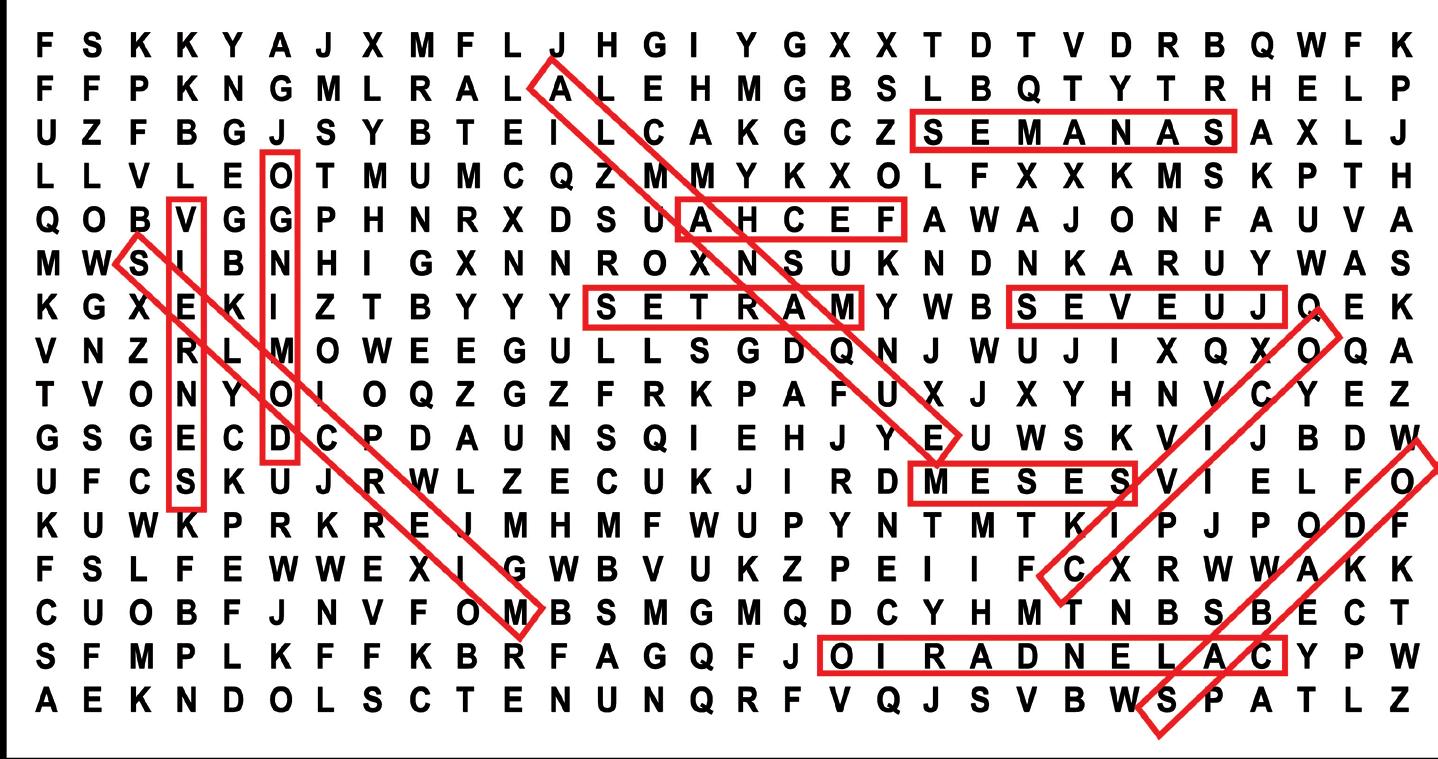ALUMINIO ACLARAN COMPRIME CALCIO EUROPIO ¡HOLA! EL... OVEJA NOTICIAS ARMADILLO IMPEDIRÁ GLOSARÁ MADRE (INV.) REL. AL CAMPO BAÑO AQUELLA EXTRAÑA FREÍR CARLOS TUDOR HIERRO (ING.) NO CREYENTE (INV.) ACTUACIÓN CON SEÑAS CARRETERA (ING. INV.) COMPAÑÍA (ABREV.) CONSON. REPETIDA TIPO DE FLAMENCO REAL ACADEMIA ESPAÑOLA INÉS JÁUREGUI RUMIANTE ANDINO DAYS (ESP.) PAÍS DE ÁFRICA UN COLOR (INV.) MENTIRA (ING.) C. DE CHILE ANILLO (Flora del mundo) MÍA (PORT.) MARCHO CUIDADO (ING.) PÚGIL MEXICANO ESPECIAL - Crucigramas - Palabras cruzadas - Sopas de letras - Sudokus - Diferencias - Laberintos - Humor y más... PROHIBIDA SU VENTA POR SEPARADO Nro. 200 Domingo 22 de enero de 2023 La Paz - Bolivia ¡AHORA CON MÁS SOPAS DE LETRAS! ESCRITOR BOLIVIANO PAÍS DE ASIA FECHA (ING. INV.) ELEMENTO QUÍMICO AÑO (ING.) ACIERTE AÑADIR PERO ACEPTAR AUMENTO EL... ILUSIONISTA