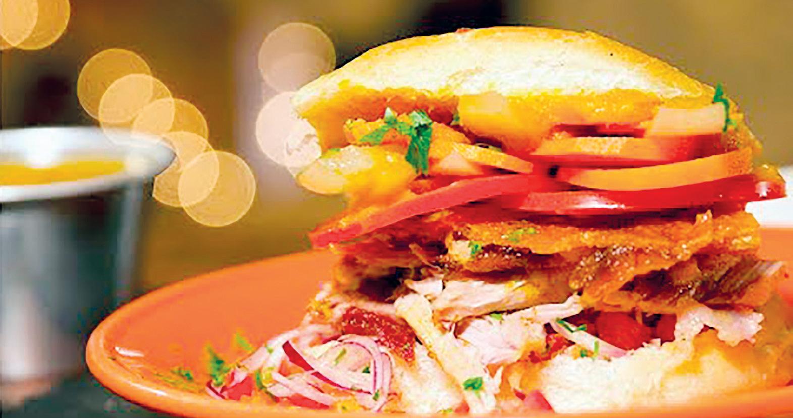 8. Cortar el pan en mitades e introducir las lonjas de carne de cerdo, la ensalada, el escabeche y ají al gusto. Es muy común acompañar esta especialidad con café o refrescos típicos.