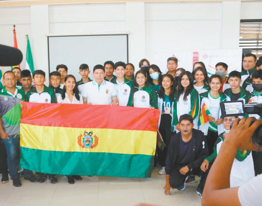 La mañana de ayer, la viceministra de De portes, Cielo Veizaga, a nombre del Gobierno nacional, entregó la bandera nacional a la dele gación de deportistas de 12 a 14 años de edad, que clasificaron a la cita deportiva internacio nal que se celebrará del 6 al 11 de diciembre en Asunción, Paraguay.