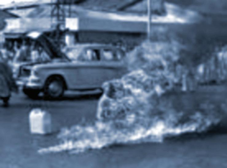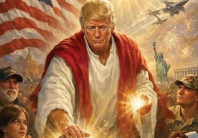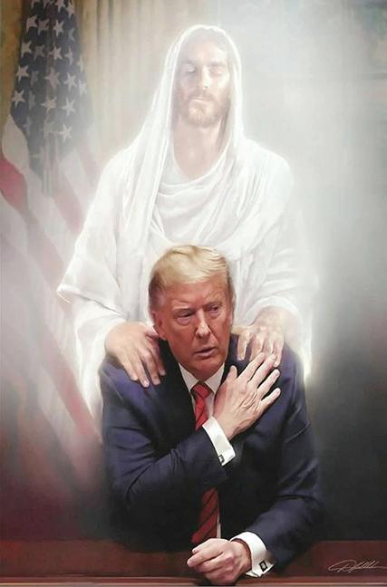aparece como alguien que recorre el mundo para salvar vidas en peligro, o para ofrecer consuelo a los moribundos. Pero este ser tan piadoso, vestido con los atuendos de Jesucristo, aparece rodeado de una verdadera parafernalia militar: aviones de guerra, soldados y, difuminadas en el fondo, amenazantes figuras monstruosas a las cuales es tan afecto Hollywood. No falta el águila norteamericana, símbolo del imperialismo yanqui, y la Estatua de la Libertad. En su delirio, Trump se presenta como el mesías predestinado a traer la luz para iluminar el sendero de la humanidad hacia su salvación. Su mano derecha descansa sobre la frente del moribundo. Este gesto no ten-