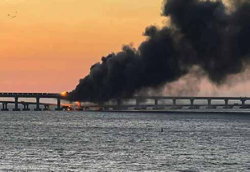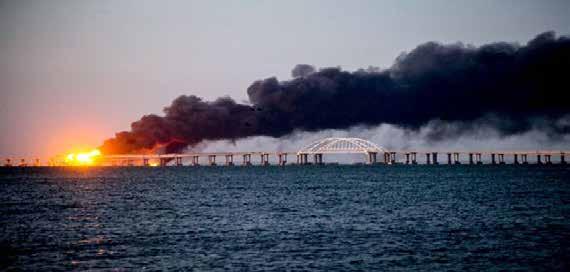cribió el sábado en su canal de Telegram una cita que parafrasea al poeta ucraniano Taras Shevchenko. “El puente arde maravillosamente al amanecer. Un ruiseñor se encuentra con la SBU en Crimea”, rezaba el texto. Medios ucranianos como Ukrainska Prav da o las agencias Ukrinform y Unian indica ron ya la víspera que, según sus fuentes, el SBU está detrás de la explosión. El puente fue inaugurado en 2018 por Putin y facilita el abastecimiento de las tropas rusas des plegadas en Ucrania. Desde entonces, se ha convertido en un símbolo de la anexión de Crimea y había sido declarado blanco legíti mos por las autoridades ucranianas.