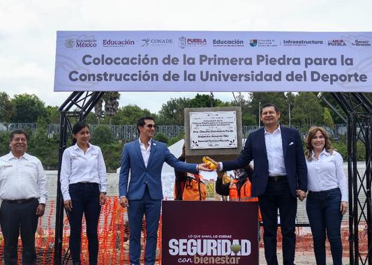 Puebla, Méx.- El Director General de la Comisión Nacional de Cultura Física y Deporte (CONADE), Rommel Pacheco Marrufo, y el Gobernador de Puebla, Alejandro Armenta Mier, colocaron este jueves la primera piedra de la Universidad del Deporte que se construirá en dicho estado.