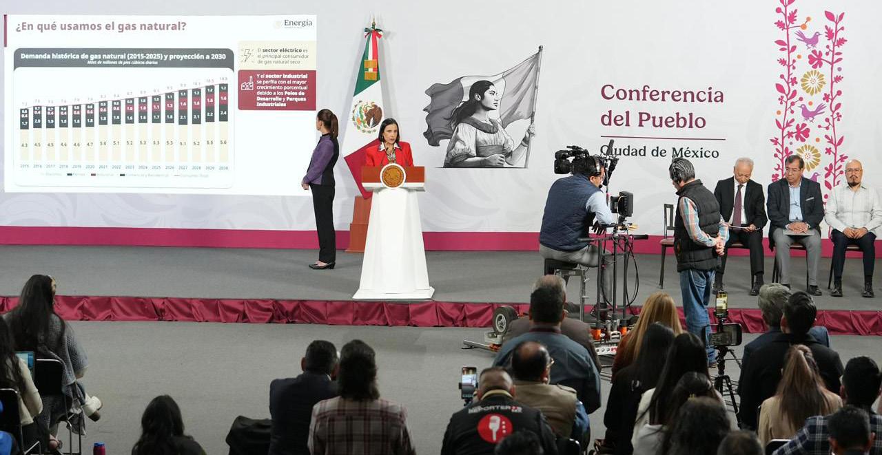 Ciudad de México.- La secretaria de Energía, Luz Elena González Escobar, presentó en la conferencia Mañanera del Pueblo, el proyecto del Gobierno de México para fortalecer la seguridad energética mediante el incremento en la producción de gas natural y reducir la dependencia del país en la importación de este insumo estratégico, el cual, explicó, es fundamental tanto para la generación de energía eléctrica como para el desarrollo de la industria. En presencia de la presidenta de México, Claudia Sheinbaum Pardo, destacó que se avanzará en el Plan de Transición Energética de manera más acelerada para la generación de electricidad con fuentes renovables de energía, llegar al 38% hacia el 2030 y reducir el porcentaje de generación con fuentes fósiles.