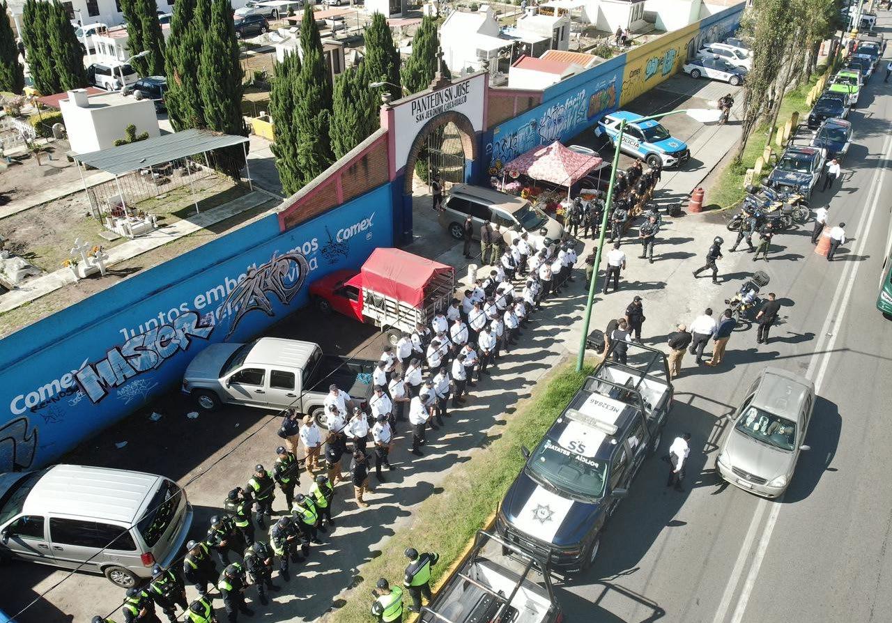 Metepec, Méx.- Con motivo de la celebración del Día de Muertos, el gobierno municipal de Metepec implementó un operativo integral de seguridad para garantizar que residentes y turistas disfruten de las tradiciones del Pueblo Mágico de manera segura y ordenada. El operativo contempla vigilancia por tierra y aire, apoyado por estrategias de inteligencia, tecnología de punta y un despliegue humano especializado. Más de 150 elementos de Seguridad Pública del municipio, incluyendo unidades caninas, de género, tránsito e intervención, participan en las labores de resguardo, junto con personal de Protección Civil y Bomberos, así como verificadores de Gobernación y personal municipal.