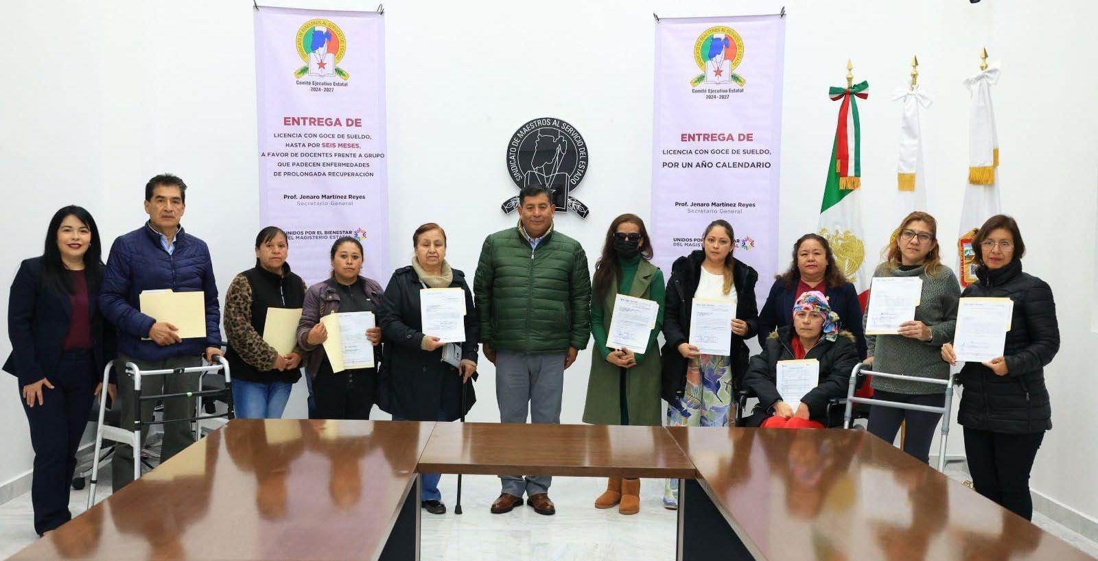 Toluca, Méx.- Como parte del cumplimiento del Convenio de Sueldo y Prestaciones vigente entre el Gobierno del Estado de México y el Sindicato de Maestros al Servicio del Estado de México (SMSEM), el Secretario General, Jenaro Martínez Reyes, encabezó la entrega de Licencias con Goce de Sueldo por un Año Calendario y Licencias improrrogables hasta por seis meses por enfermedad no profesional y de prolongada recuperación. Esta prestación laboral permite que las y los docentes atiendan su salud sin afectar su estabilidad económica ni su permanencia en el servicio educativo, respaldo que forma parte de las conquistas sindicales que el SMSEM mantiene vigentes para su base afiliada.