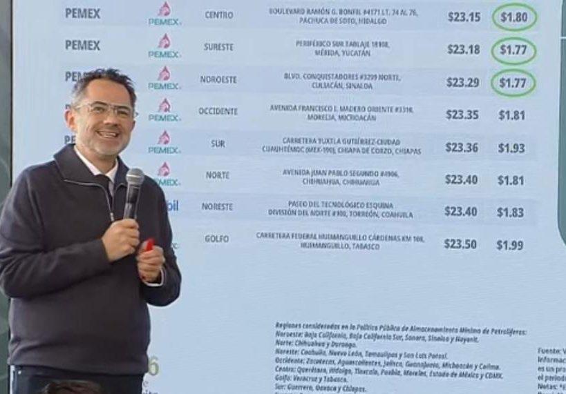 El funcionario enfatizó que, en general, los márgenes de ganancia en ninguna región superan los 2 pesos, pero señaló el caso de la estación Petro Seven en Arteaga, Coahuila, con un precio de 24.99 pesos y un margen de ganancia de 3.27 pesos. Por el contrario, el
