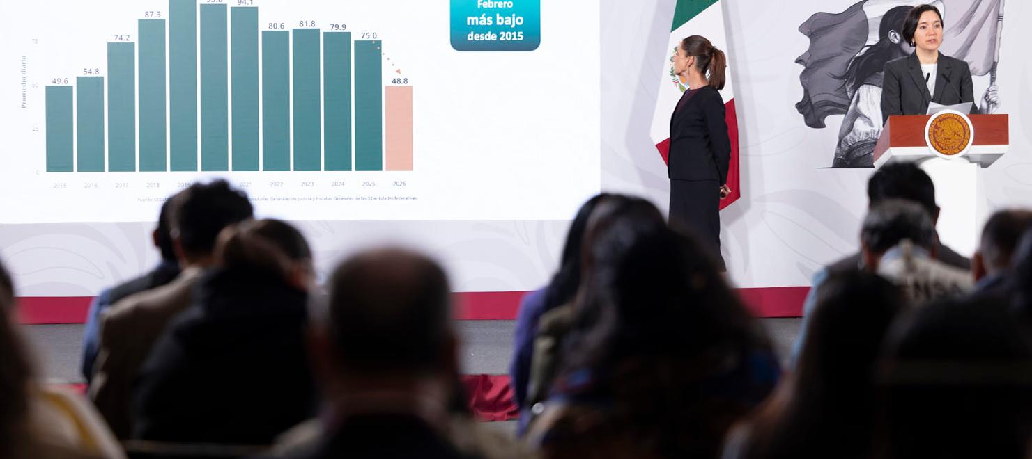 La Secretaria Ejecutiva del Sistema Nacional de Seguridad Pública señaló que el sexenio de Sheinbaum arrancó con un promedio de 86.9 homicidios diarios en el país y que en febrero de 2026 cerró en 48.8, por lo que se convirtió en el mes más bajo de este periodo analizado.