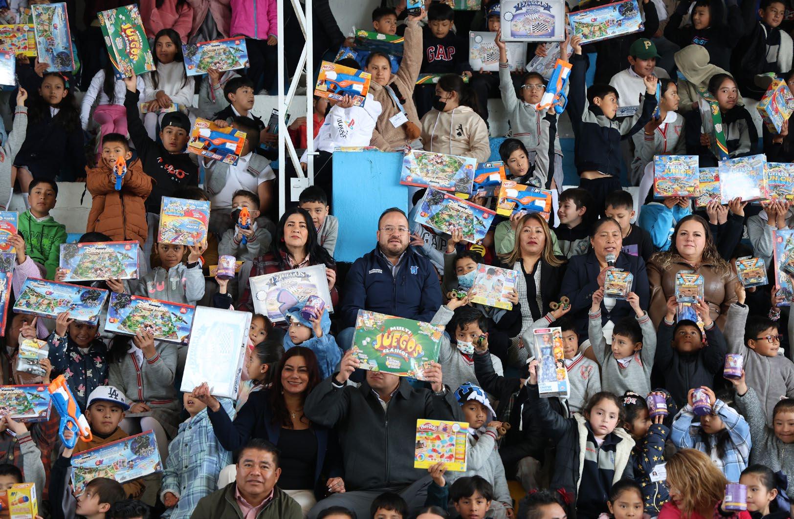 En la Primaria “Fray Ignacio Toriz”, ubicada en la Cabecera Municipal, el Gobierno de Huixquilucan concluyó con la entrega de 26 mil juguetes a estudiantes de diversas escuelas del territorio, con el propósito de llevar alegría y amor a cada infante y reconocer su esfuerzo, buen comportamiento y dedicación al asistir a clases. Durante la festividad, del Día de Reyes, la presidenta municipal compartió con los estudiantes que la entrega de estos juguetes tiene el propósito de fomentar una sana convivencia entre sus compañeros y contribuir a su desarrollo integral, pues jugar impulsa habilidades físicas, cognitivas, sociales y emocionales, mejorando la motricidad, la creatividad y la empatía,
