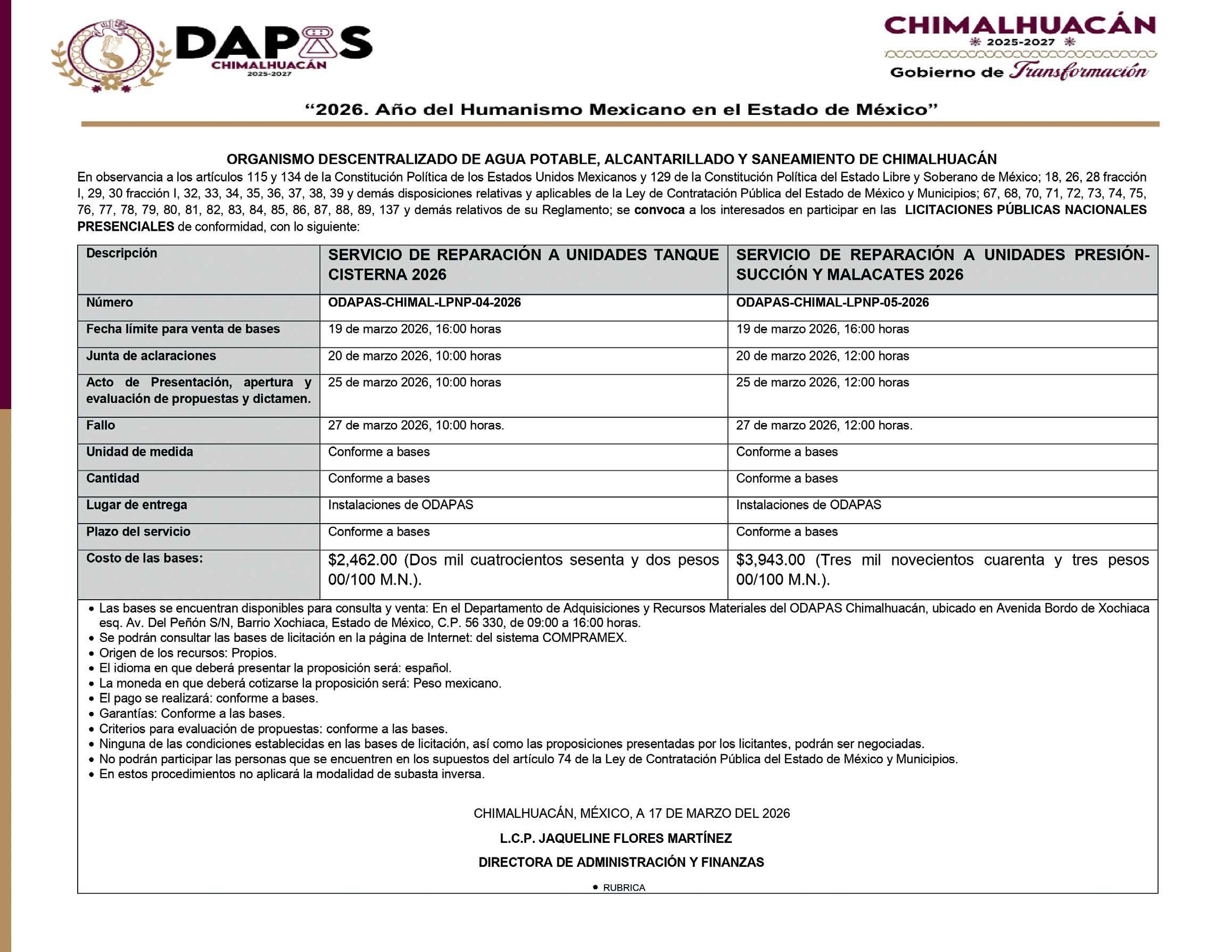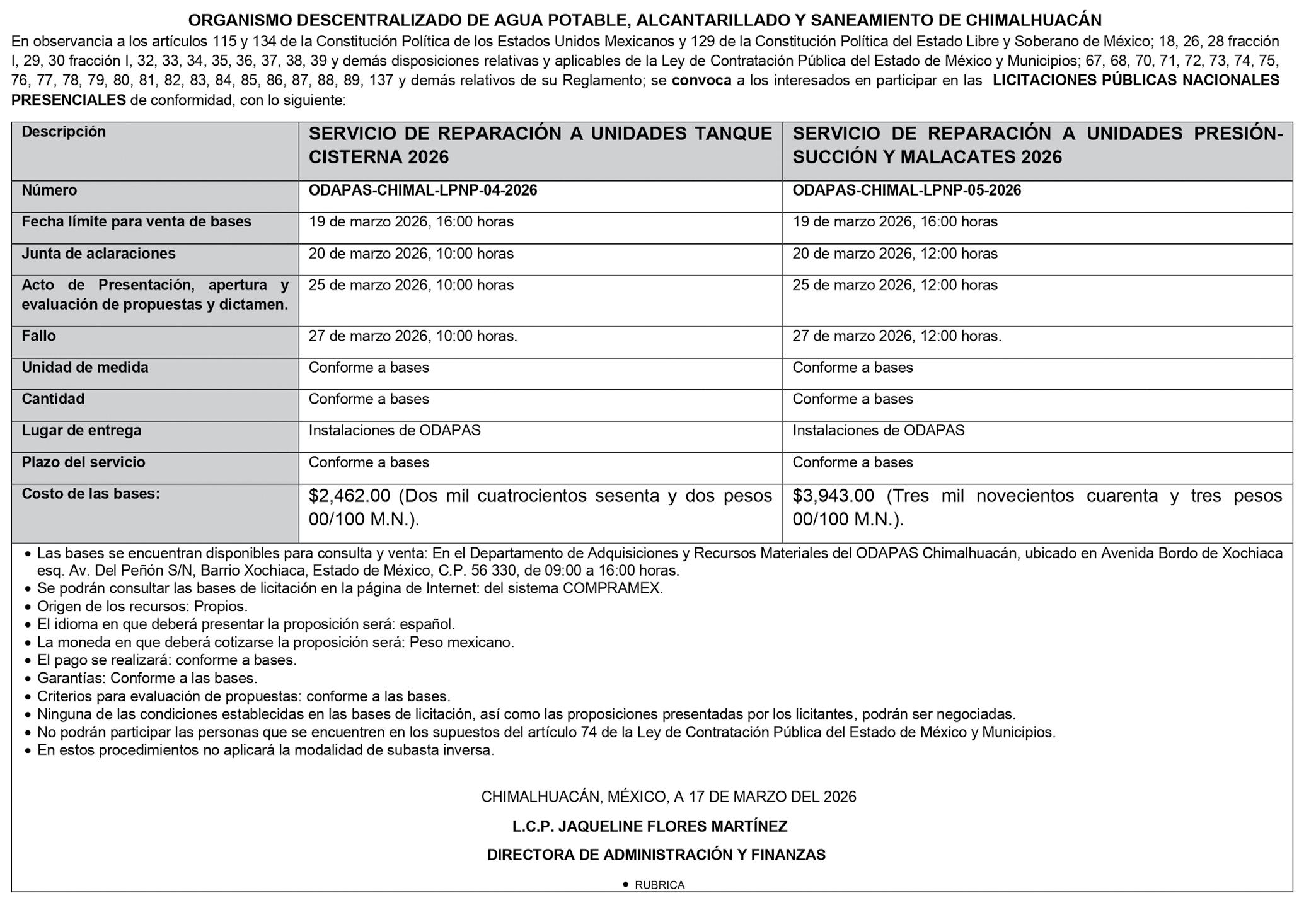 • Criterio de evaluación de propuestas: método binario, para las adjudicaciones correspondientes. Toluca, Estado de México, 17 de marzo de 2026.