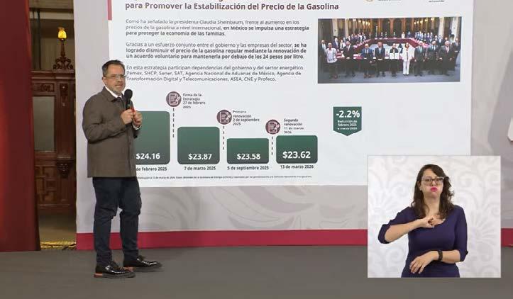 Ciudad de México. – Durante la conferencia mañanera, el titular de la Procuraduría Federal del Consumidor (PROFECO), por sus siglas, anunció el seguimiento a la Estrategia Nacional para Promover la Estabilización del precio de la Gasolina en México y cuidar el bolsillo de las familias mexicanas; como lo ha señalado la presidenta, la Dra. Claudia Sheinbaum Pardo, frente al aumento de los precios de la gasolina a nivel internacional, gracias a un esfuerzo conjunto entre el gobierno y las empresas del sector, se ha logrado disminuir el precio de la gasolina regular mediante la renovación de un acuerdo voluntario para mantenerla por debajo de los 24 pesos por litro. En esta estrategia participan estrategias del gobierno y del sector energético como: PEMEX, SHCP,