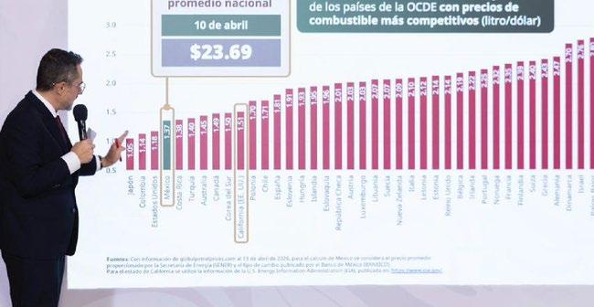 Mencionó que al 10 de abril, el precio promedio nacional del litro del combustible regular fue de $23.69 pesos y con ello México se encuentra dentro del Top 5 de los países que integran la Organización para la Cooperación y Desarrollo Económico (OCDE) con precios de combustible más competitivos (litro/dólar).