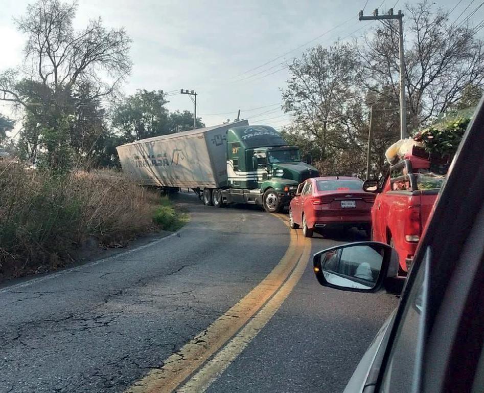 Tenancingo, Méx.- Un tráiler estuvo a punto de volcarse tras quedar inclinado sobre la carretera Tenango del Valle–Tenancingo, a la altura de las curvas del pozo de San Martín, lo que obligó durante más de doce horas al cierre total de esta vía que comunica con la zona sur del Estado de México.