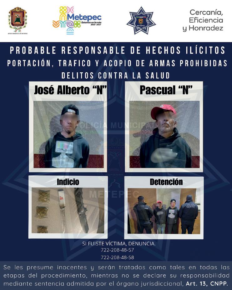 De acuerdo a las autoridades, el aseguramiento se produjo tras un reporte ciudadano recibido en el Centro de Mando. Al acudir al lugar, los oficiales encontraron a José Alberto “N” y Pascual “N”, quienes portaban armas punzocortantes y sustancias con características de narcóticos. Ambos fueron asegurados y puestos a disposición del Ministerio Público para determinar su situación jurídica conforme a la ley. Autoridades municipales destacaron que este tipo de intervenciones refleja el compromiso de la corporación por actuar con profesionalismo, legalidad y prontitud, reforzando la seguridad y el orden en Metepec.