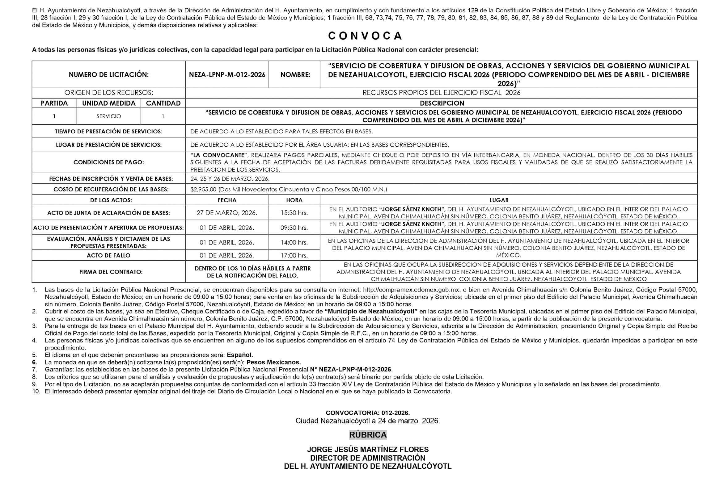9. Será requisito para participar, una vez compradas las bases, que los interesados entreguen hasta el 09 de abril de 2026, la información y documentos a que se refiere esta convocatoria , la que se sujetará a la revisión detallada de la información. (Entregar publicación original)