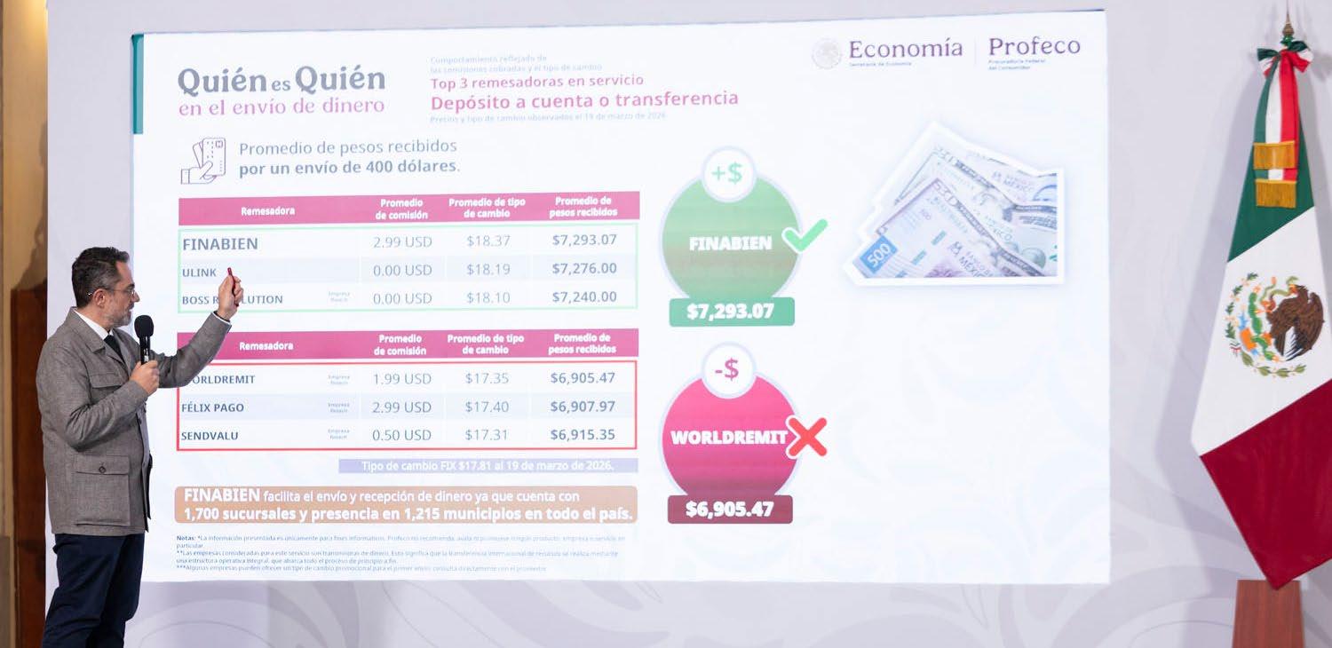 iudad de México.- En la conferencia mañanera, encabezada por la presidenta Claudia Sheinbaum Pardo, el titular de la PROFECO, César Iván Escalante Ruíz, dio a conocer las cifras sobre los precios de la canasta básica y servicios importantes en su sección “Quién es quién en los precios”, misma que tiene por objetivo cuidar el bolsillo de las familias mexicanas. Comenzando con las empresas que son remesadoras, toma el primer lugar FINABIEN, que sigue dando más pesos mexicanos por dólares que se envían a los paisanos que se encuentran en el extranjero en un ejercicio realizado de 400 dólares, en contraste con la anterior, la que menos otorga dólares en la conversión es la empresa Worlddremit, por lo que es importante comparar las remesadoras a utilizar. Por otra parte, en el seguimiento de la estrategia para promover el establecimiento del precio nacional de gasolinas, a más de una semana de la renovación de la Estrategia,