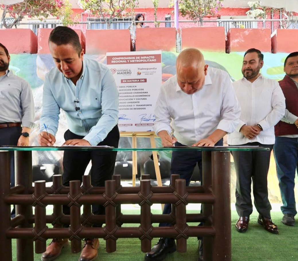 Tlalnepantla, Méx.Los alcaldes de Tlalnepantla, Raciel Pérez Cruz y de Gustavo A. Madero, Janecarlo Lozano Reynoso, firmaron un convenio de colaboración a través del cual, ambas entidades se comprometen a trabajar de manera conjunta en temas de seguridad ciudadana, permitiendo una respuesta más eficaz ante las necesidades de quienes viven y transitan en la región metropolitana. El convenio contempla también, la coordinación en infraestructura, obra pública y movilidad, lo que busca soluciones integrales que trasciendan los límites territoriales y mejoren la calidad de vida de las familias y fortalecer la coordinación metropolitana.