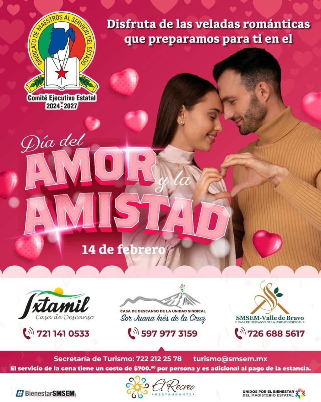 Toluca, Méx.- Con motivo del Día del Amor y la Amistad, el Sindicato de Maestros al Servicio del Estado de México (SMSEM) llevará a cabo veladas románticas el próximo 14 de febrero en las Casas de Descanso de la Unidad Sindical Sor Juana Inés de la Cruz, Valle de Bravo e Ixtamil, espacios que abrirán sus puertas para ofrecer una experiencia distinta a las y los docentes afiliados.