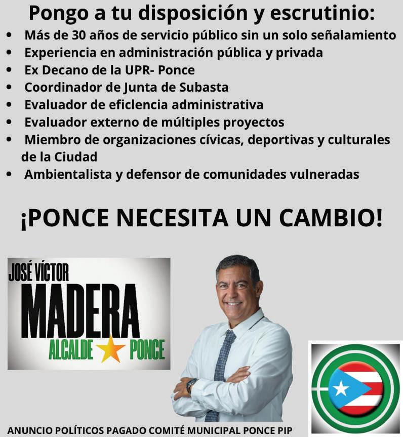 PONCE- José Víctor Madera Cabán nació en la Central Aguirre en Salinas, pero de niño sus padres se mudaron a la Ciudad Señorial, donde siempre ha residido. Es doctor en Literatura, dicta cátedra en la Universidad de Puerto Rico en Ponce, ha estado mano a mano con varias comunidades del sur en sus luchas por una mejor calidad de vida y es la cuarta vez, que busca la alcaldía ponceña bajo la insignia del Partido Independentista Puertorriqueño (PIP). “Soy producto de la escuela pública, me gradué de la Ponce High y de la universidad pública”, dijo al resumir que lleva 29 años de labores en el sistema universitario y también, ha impartido clases en la Pontificia Universidad Católica. En la UPR, ha ocupado varios puestos administrativos y también ha presidido la Asociación Puertorriqueña de Profesores Universitarios (APPU). Además, ha estado ligado a varias organizaciones deportivas. Adjudicó al bipartidismo PPD-PNP, “que no ha llenado las expectativas de la ciudad”, las irregularidades y deficiencias señaladas a las pasadas administraciones municipales.