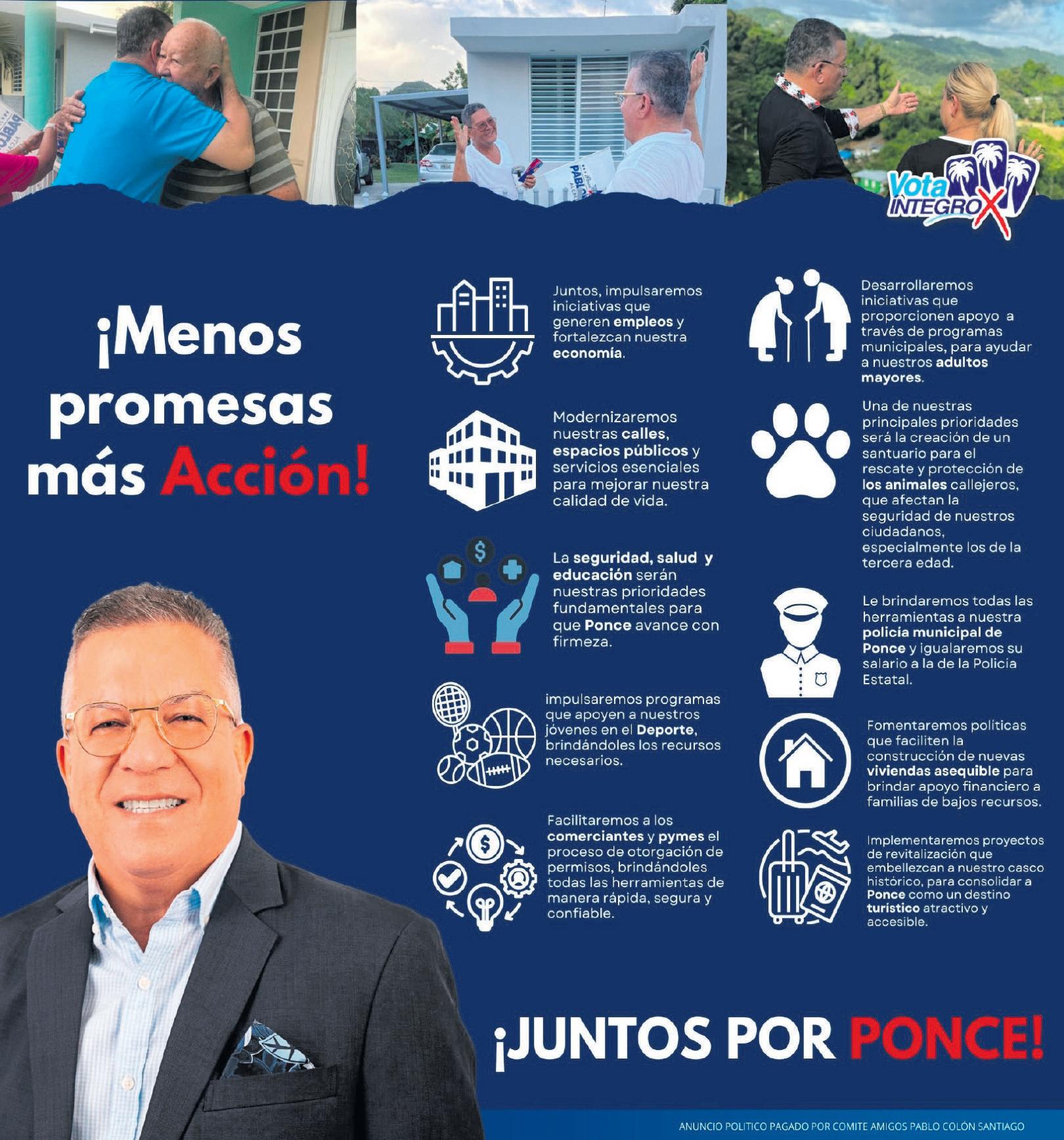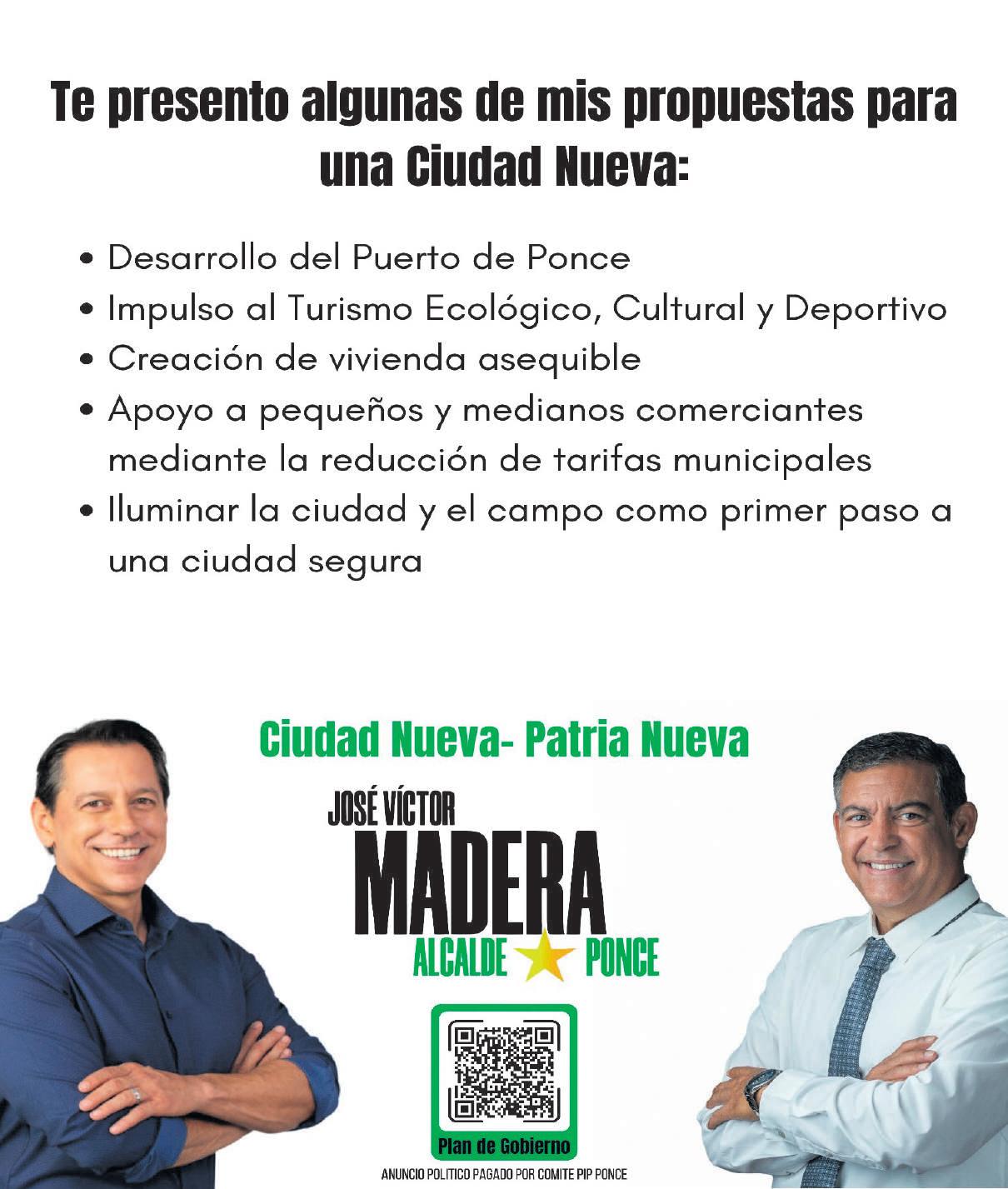“En el caso de Ponce la Alianza entre el PIP y el MVC, es prácticamente inexistente, excepto en la papeleta a la gobernación y comisaría residente. Los dos partidos tiraron un candidato a alcalde pudiendo haberse puesto de acuerdo, como en otros sitios incluyendo Juana Díaz, que está ahí pegado y hay un candidato de la Alianza. Acá en Ponce no ocurrió, no entiendo por qué razones, pero es una verdadera pena que no hayan logrado un consenso para lanzar un solo candidato”, sostuvo . El también líder cooperativista resaltó además, que las irregularidades señaladas en el manejo del proceso en la CEE han creado dudas y descon anza. “Eso podría disuadir especialmente a los sectores más conscientes y probablemente más maduros y de mayor edad, de participar porque piensan, ‘no importa lo que yo haga, alguien se va a robar las elecciones’”, indicó Cepeda. A nivel del distrito de Ponce dijo que no