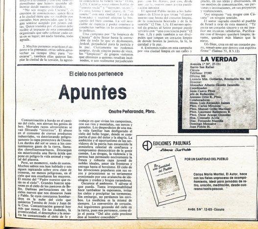 Apuntes, fue el nombre de la columna que acompañó durante tres décadas a los lectores del periódico La Verdad (desde la edición N°115 del 23 de abril de 1989 hasta la edición N°901 del 19 de diciembre de 2021). Escrita por el recordado presbítero Onofre Peñaranda Peñaranda que plasmó en ella su compromiso con la evangelización de una forma jocosa, relatando historias, anécdotas y dejando un mensaje para reexionar a nuestros lectores.