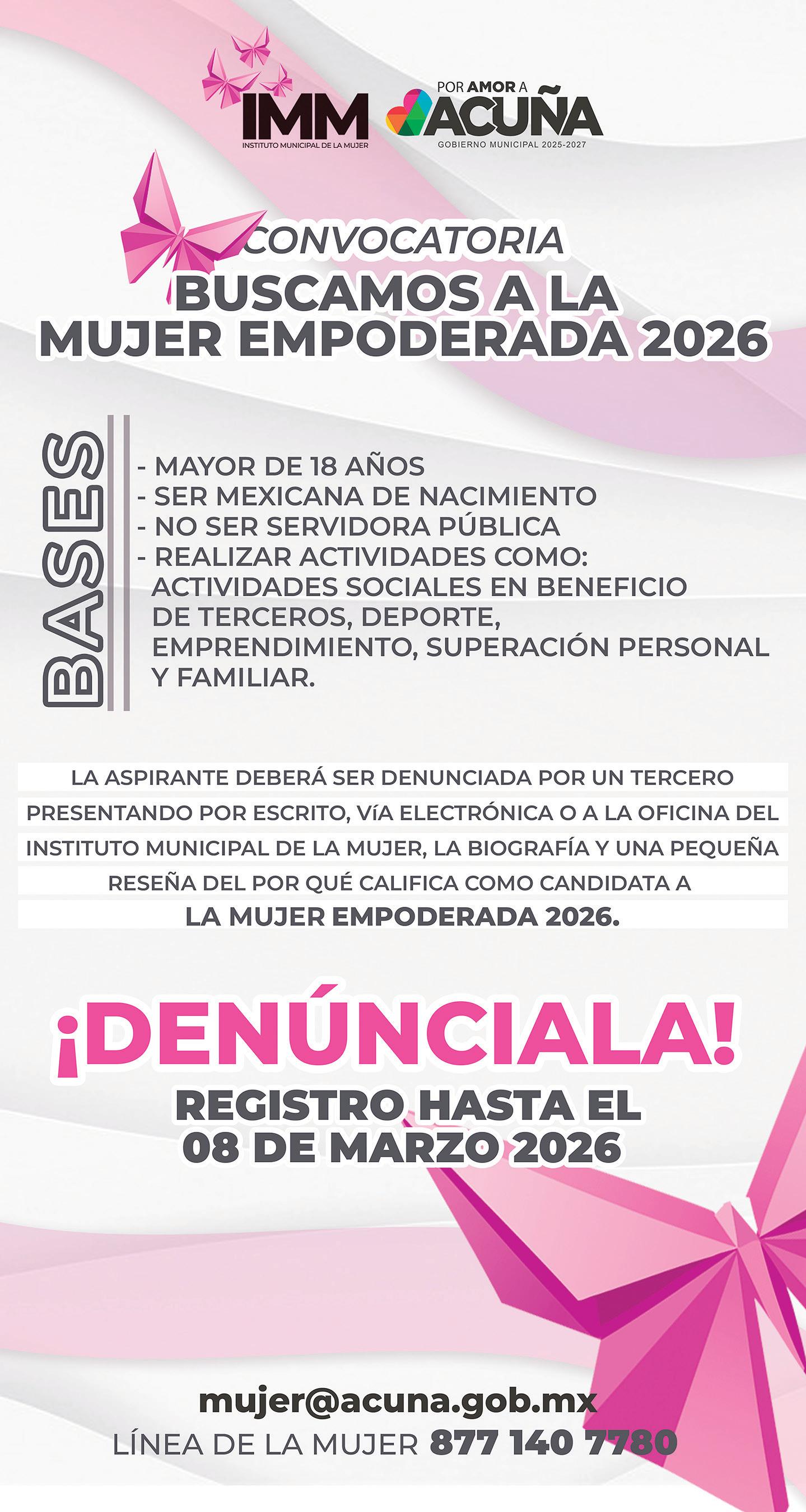 Dentro del marco del Día Internacional de la Mujer a celebrarse este próximo domingo 8 de marzo, el Instituto Municipal de la Mujer amplió la fecha de convocatoria precisamente para cerrarse ese día y designar a la “Mujer Empoderada 2026” en Ciudad Acuña. Este reconocimiento por parte de la administración municipal que encabeza el alcalde, Emilio de Hoyos Montemayor, va dirigido a mujeres que transforman su entorno y dejan huella en su comunidad en diferentes ámbitos como puede ser de acciones sociales, deporte, superación personal y emprendimiento. Por lo tanto, la invitación continúa abierta para quienes deseen “denunciar” o nominar a alguna mujer que consideren que inspira, lucha e impulsa el desarrollo, la igualdad y valores de equidad y respeto para el crecimiento de todos los ámbitos de su vida, pero también para mejorar las condiciones de igualdad de género para las nuevas generaciones. Esto puede manifestarse a través de la educación o de sus aportaciones a la ciencia, a la economía o el desarrollo social como se contempla dentro del activismo, a la par de que también pueden desta-