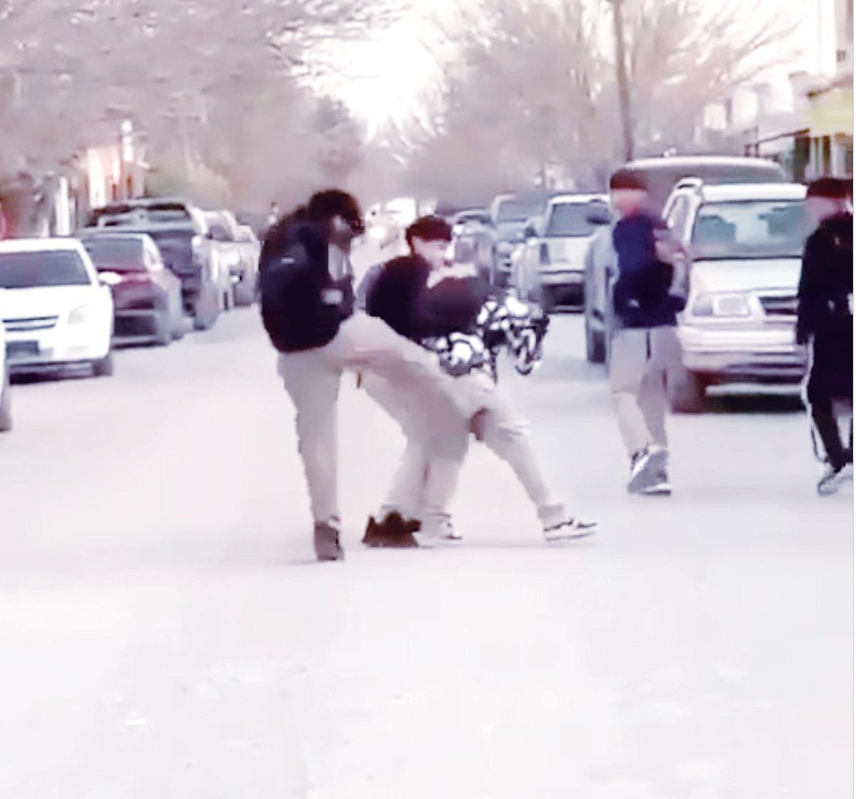 De acuerdo con las imágenes, se observa que un adolescente camina al salir del plantel y repentinamente dos estudiantes lo sorprenden por la espalda propinándole un peñascazo en la cabeza que le ocasionó una lesión de cinco centímetros y probable fractura de cráneo.