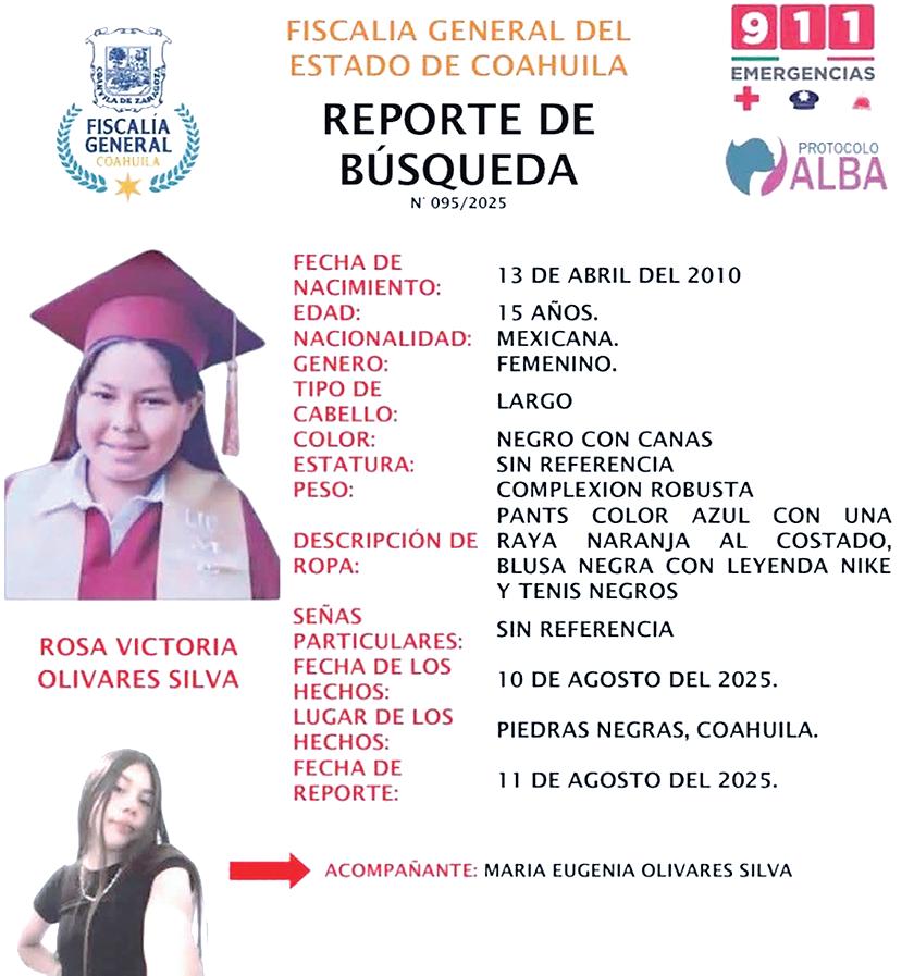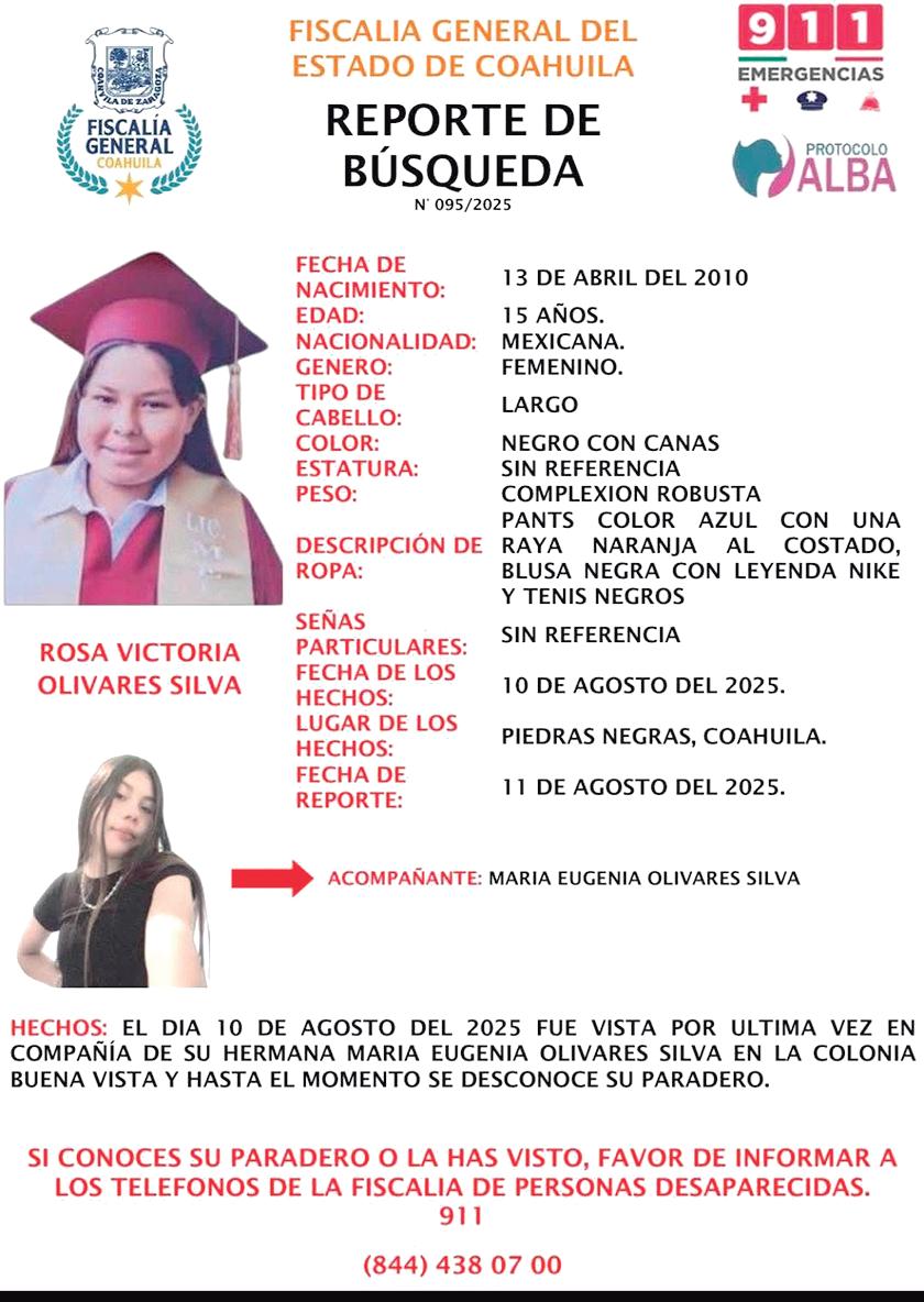 María Eugenia Olivares Silva, de 11 años y su hermana Rosa Victoria de 15, son dos hermanas adolescentes que residen en la colonia Buena Vista, y fueron reportadas como desaparecidas ante la Fiscalía Especializada, quien ya emitió la Alerta Amber. Las menores salieron de su casa el pasado domingo y sus padres ya no supieron más de ellas y comenzó la búsqueda.