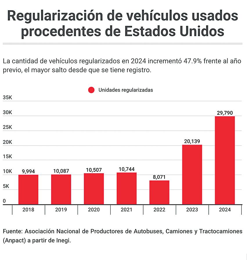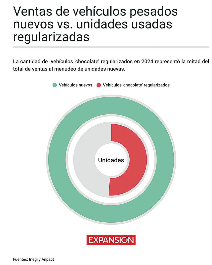 con políticas públicas que generan efectos contrarios. Una de ellas es la regularización de vehículos usados importados desde Estados Unidos, los llamados vehículos “chocolate”, que ingresan de manera ilegal o irregular a México. La Asociación Nacional de Productores de Autobuses, Camiones y Tractocamiones (Anpact) ve una contradicción entre querer incentivar la demanda interna, mientras se mantiene abierto un canal