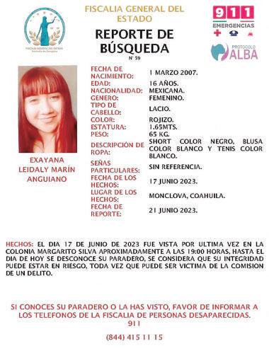 momentos el teléfono de su hija está encendido, llaman y nadie contesta, luego cuelgan y lo apagan. Trascendió que la señal se activa en una antena de telefonía celular en Piedras Negras, Coahuila, por lo que sospechan que pudiera estar en esta frontera de Coahuila con alguna persona o que alguien la haya trasladado con engaños o por la fuerza hasta esta región. El día de su desaparición vestía blusa plateada con cuadritos negros, malla negra y zapatos tipo botín negros con letras blancas. Si usted tiene alguna in-