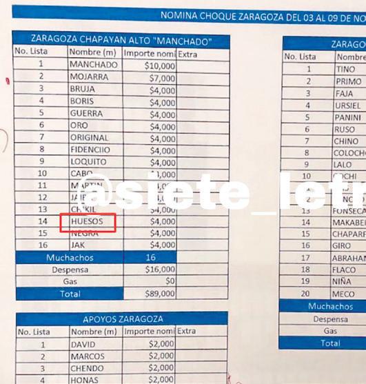 Los pagos registrados in cluyen salarios semanales a más de una treintena de halcones que van de dos mil 500 a tres mil pesos cada uno, a pistoleros por alrededor de cuatro mil pesos semanales.