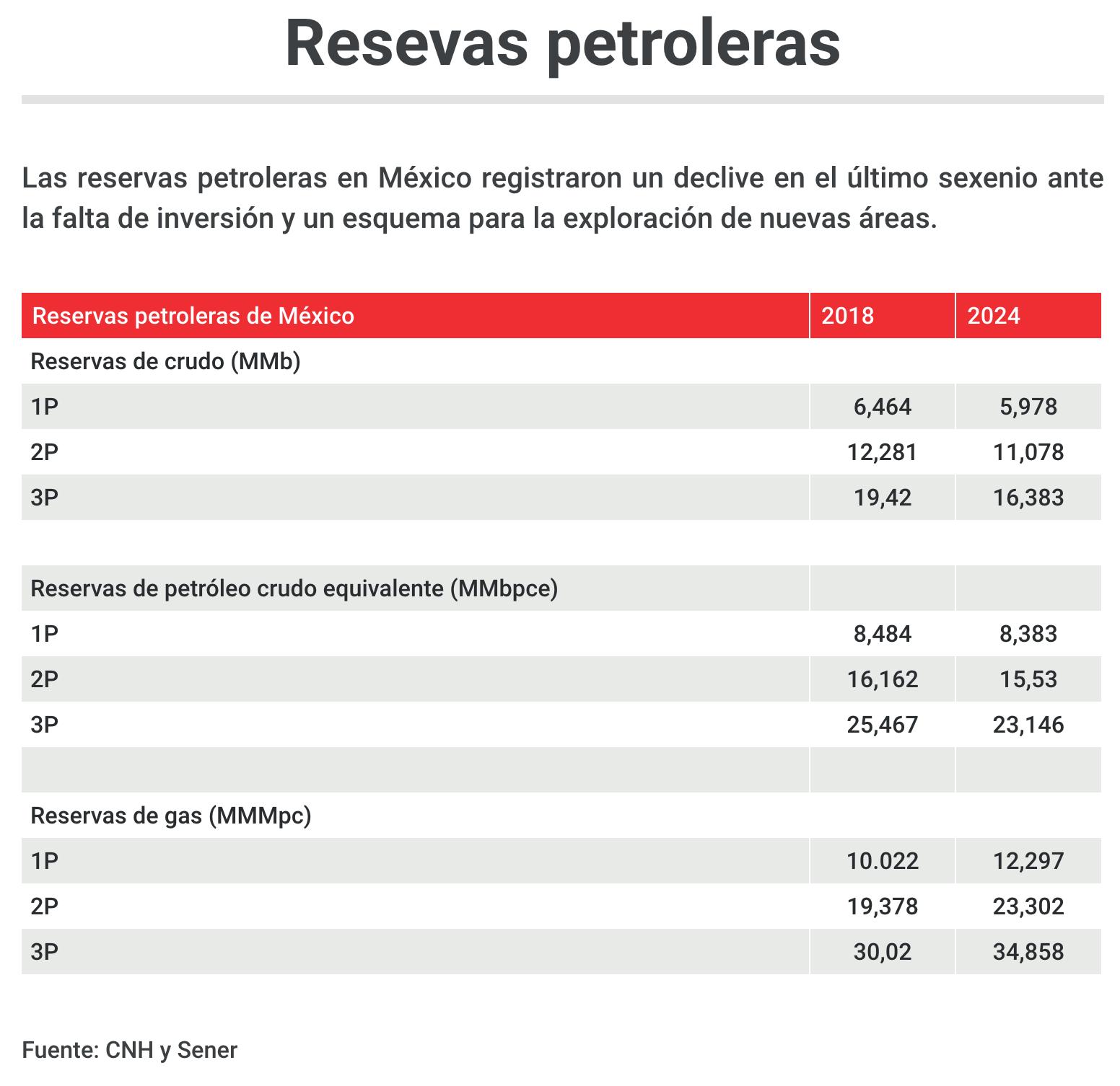 En el caso del crudo, las reservas 1P pasaron de 6 mil 464 millones de barriles en 2018, a 5 mil 978 millones en 2024. Para 2025 no existe actualización de las cifras de reservas, pues la CNH no publicó su informe anual previo a su extinción, pero se espera que las ci-