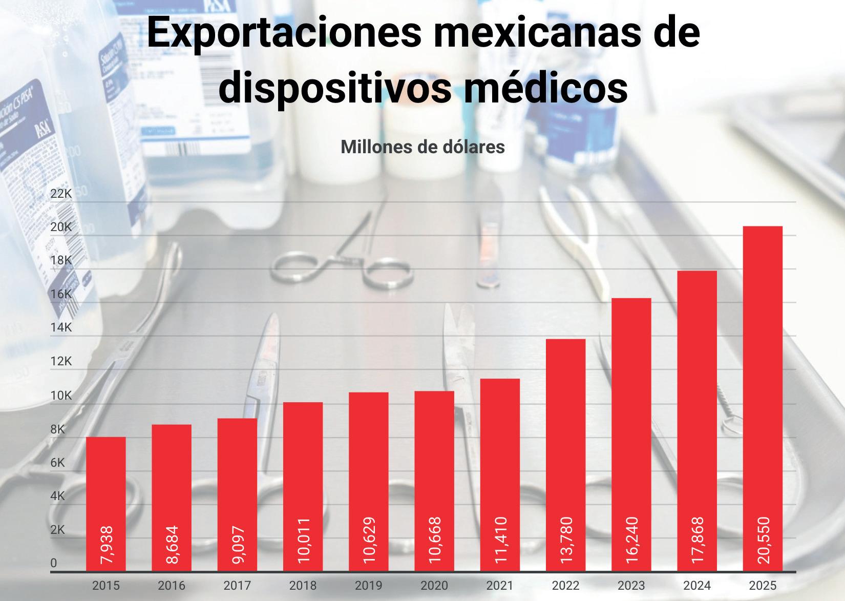 El país duplicó el valor de sus exportaciones de dispositivos médicos en apenas cinco años. En 2020, año marcado por la pandemia de Covid-19, las ventas externas alcanzaron 10 mil 668 millones de dólares. Para 2025, el monto llegó a 20 mil 550 millones, según datos del Banco de México.