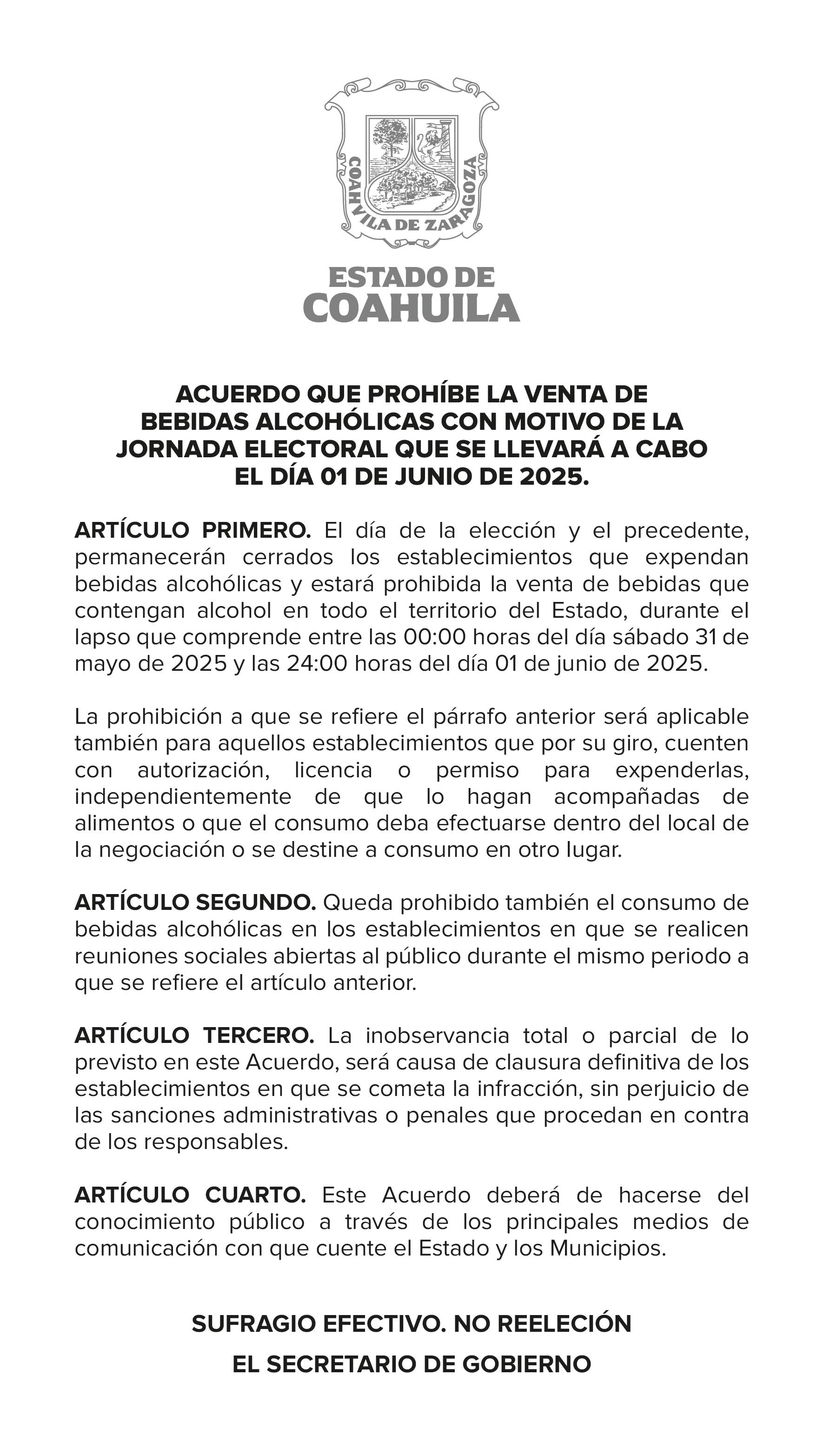 El Gobierno Federal emitió un decreto para prohibir la venta y el consumo de bebidas alcohólicas en los establecimientos que cuentan con licencia de alcoholes, esto con el fin de garantizar el orden público durante el desarrollo de la jornada electoral, así lo dio a conocer el alcalde, Emilio Alejandro de Hoyos Montemayor. Manifestó que de acuerdo al decreto, el periodo de prohibición iniciará a las 00:00 horas del 31 de mayo y concluirá a las 23:59 horas del primero de junio, por lo que las personas que sean sorprendidas en estado inconveniente o vendiendo bebidas embriagantes serán sancionadas conforme a la ley y puestas a disposición de las autoridades correspondientes. En el caso de los negocios, estos serán clausurados, se procederá al decomiso del