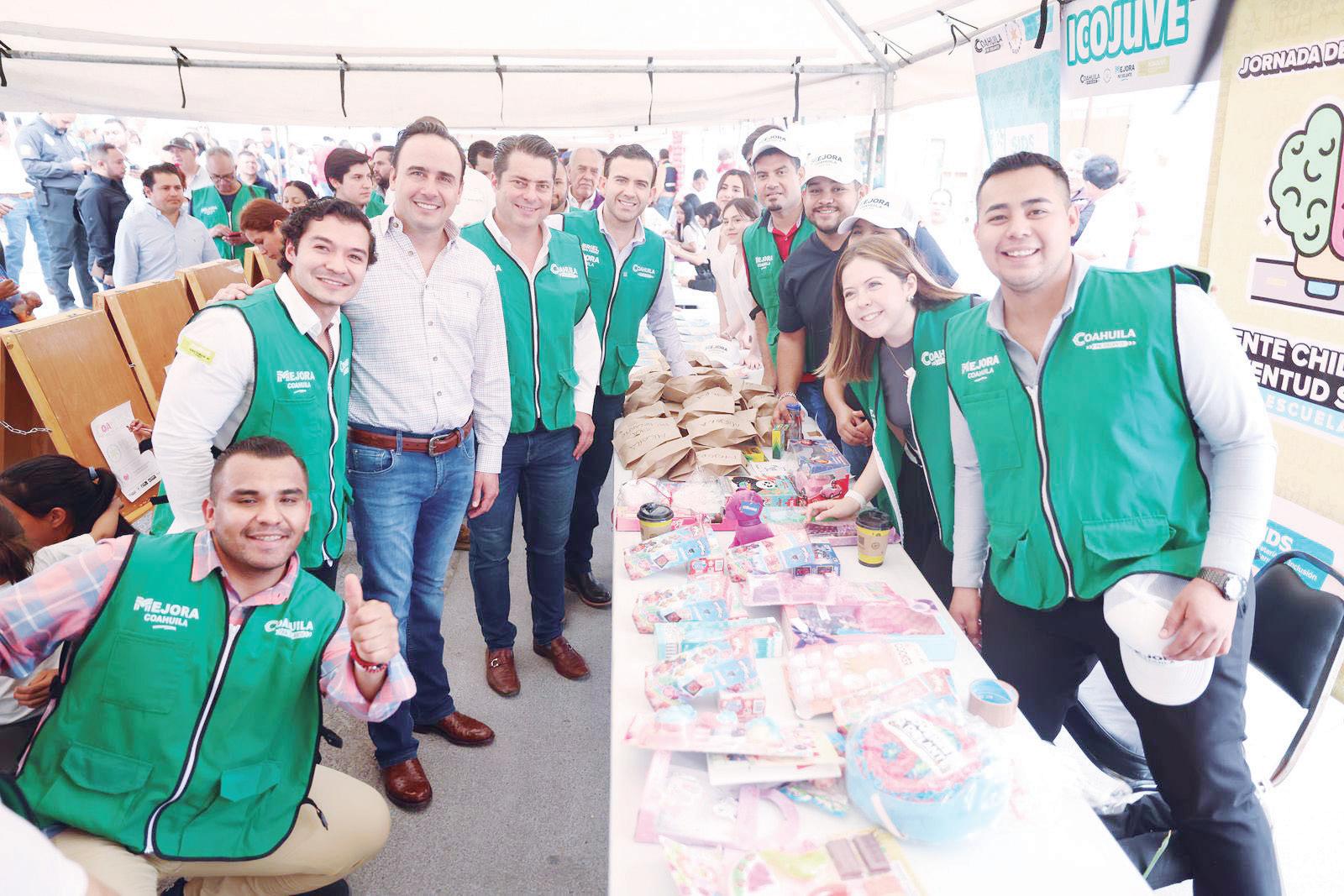 Acompañado por Luz Elena Morales, presidenta de la Junta de Gobierno del Congreso del Estado; Gabriel Elizondo Pérez, coordinador general de Mejo ra Coahuila, y titulares de dis tintas dependencias estatales, el Mandatario estatal recorrió los módulos instalados en la plaza principal del ejido Piedras Negras, donde convivió con familias y estudiantes de instituciones educativas. El Gobernador manifestó que su Administración sigue avanzando con el desarrollo integral del estado, mediante programas que atienden de manera directa las necesidades de la población.