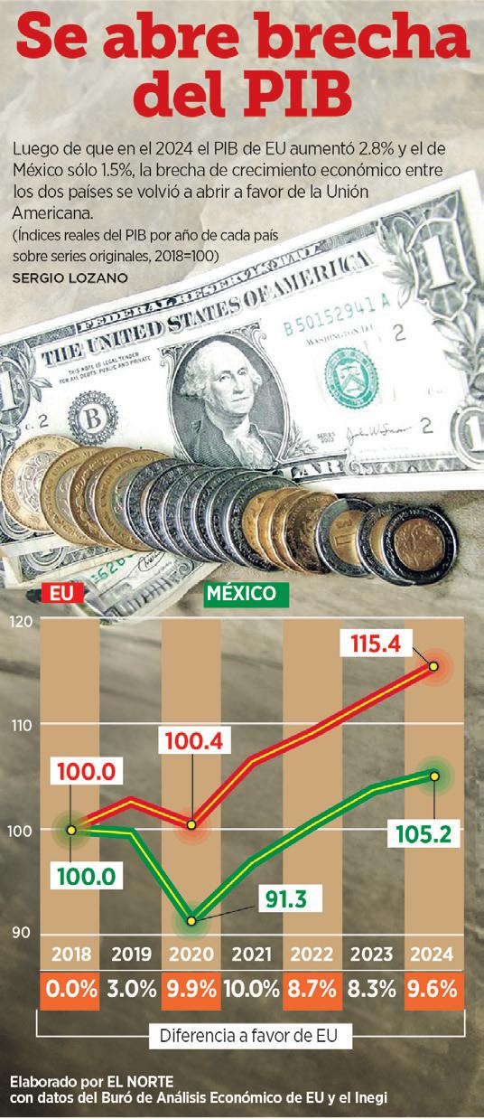 mos producidos en México dentro de cadenas de valor diseñadas para abastecer a empresas en EU. Dado que las exportaciones mexicanas representan aproximadamente 34% del PIB, una reducción de 15% –por ejemplo– implicaría hasta 5 puntos del PIB. Si la reducción fuera de 10%, la pérdida sería de 3.4 puntos. Claro que, al bajar también las importaciones, se neutraliza parte de la caída, por lo que el impacto sería menor a las cifras señaladas, tal vez de 1 a 2 puntos del PIB.