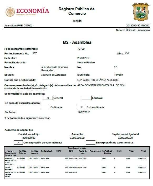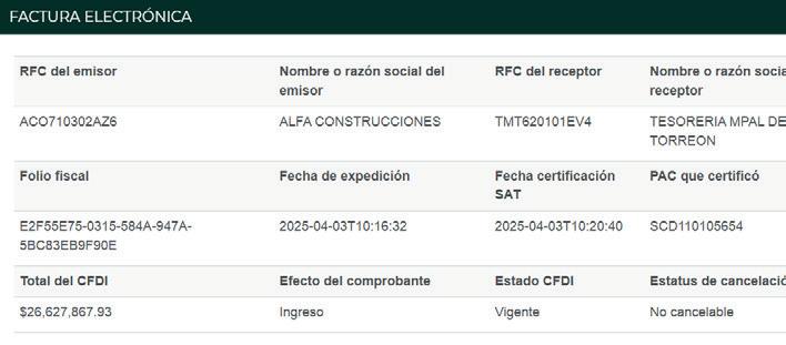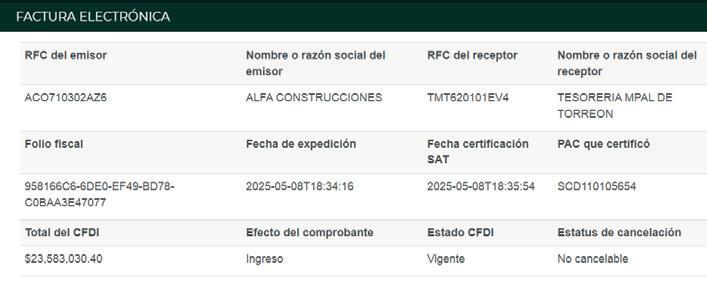 suma de lo facturado por el contratista beneficiado, Alfa Construcciones, S.A. de C.V., asciende a 275 millones 573 mil pesos, a razón de 11 certificados cobrados en 2024 y siete más durante 2025, hasta el 8 de mayo el último (por 23 millones 583 mil 30 pesos). Entre marzo y mayo de 2025, para dimensionar, Alfa se ha embolsado casi 75 millones de pesos producto de tres facturas, una por mes, sin descartar que, en junio, aún sin concluir, otros documentos hayan sido presentados a cobro a Tesorería Municipal. Alfa Construcciones pertenece a los hermanos Allegre del Cueto: Alberto Francisco José Antonio, Jaime Andrés, y Francisco Javier René. Antes de la citada obra multimillonaria, la empresa había facturado sólo 950 mil 579 pesos al Municipio de Torreón en 2023, y en 2022 obtu-