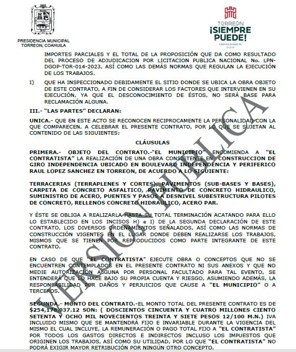 Además no construyó cualquier cosa, sino la obra insignia del trienio 2022-2024 en Torreón debido a su cuantía, con la que pretende ser recordado su Alcalde, Román Alberto Cepeda: el Giro Independencia. Sin embargo, ese presunto círculo virtuoso no fue impedimento para que Tesorería Municipal pagase 21.4 millones de pesos adicionales al precio convenido. Casi “el diezmo”, considerando que este se fijó en 254 millones 178 mil 937 pesos, ya con impuestos incluidos, y una cláusula especial que textualmente señalaba una obligación para el contratista: “no podrá exigir mayor retribución por ningún otro concepto”, ya que “el monto total se mantendrá fijo e invariable durante la vigencia del contrato”.
