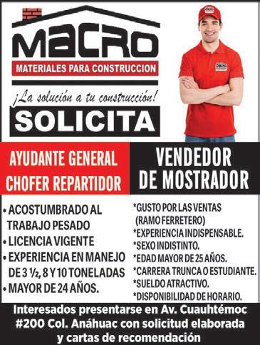 TECNOLOGIA AVANZADA SOLICITA OFICIAL ALBAÑIL, Y AYUDANTE ALBAÑIL, INSPECTOR DE SEGURIDAD PARA TRABAJAR EN TEKSID. INFORMES AL 866-118-00-35. (58326 : 28-Jun : 06-Jul)